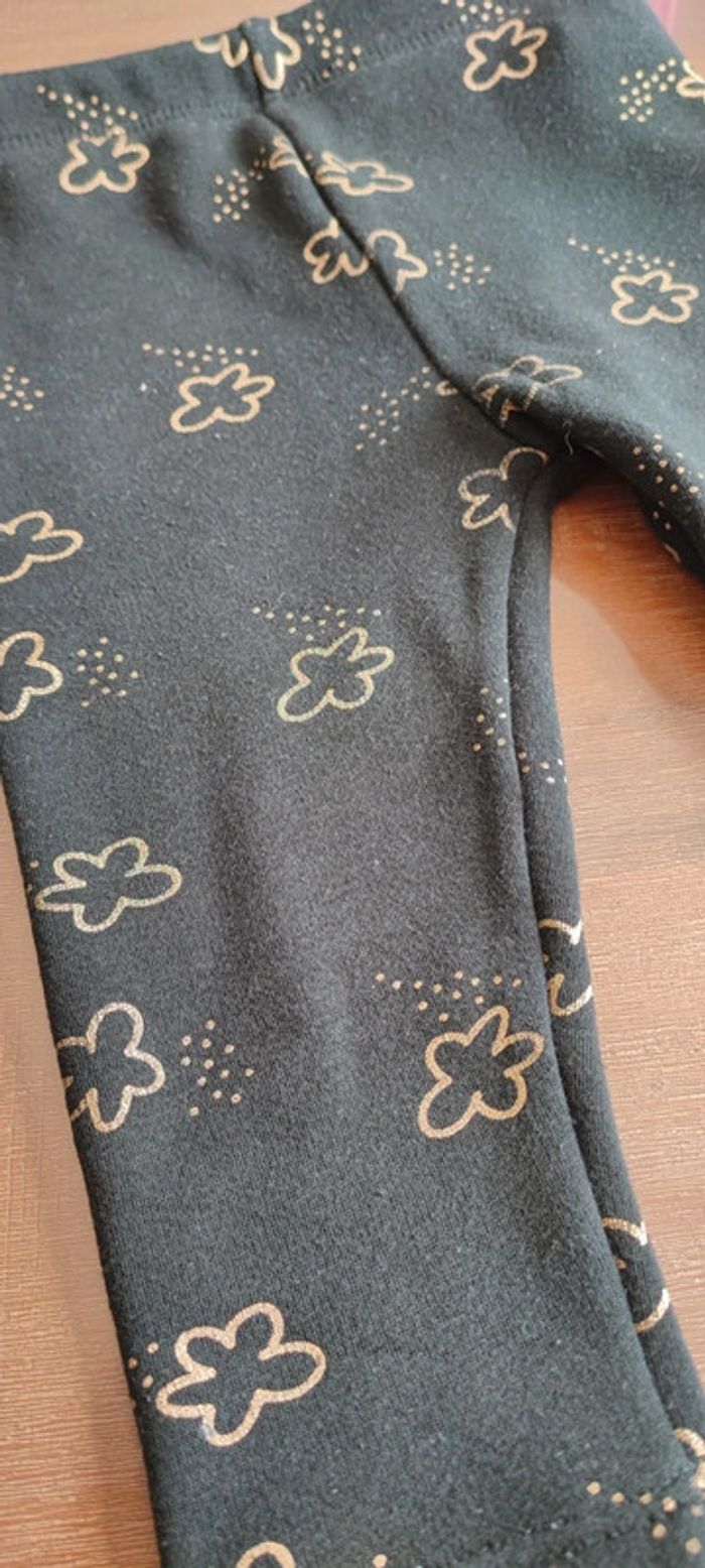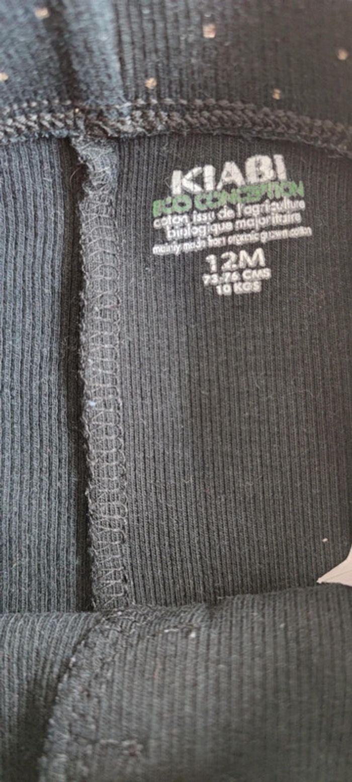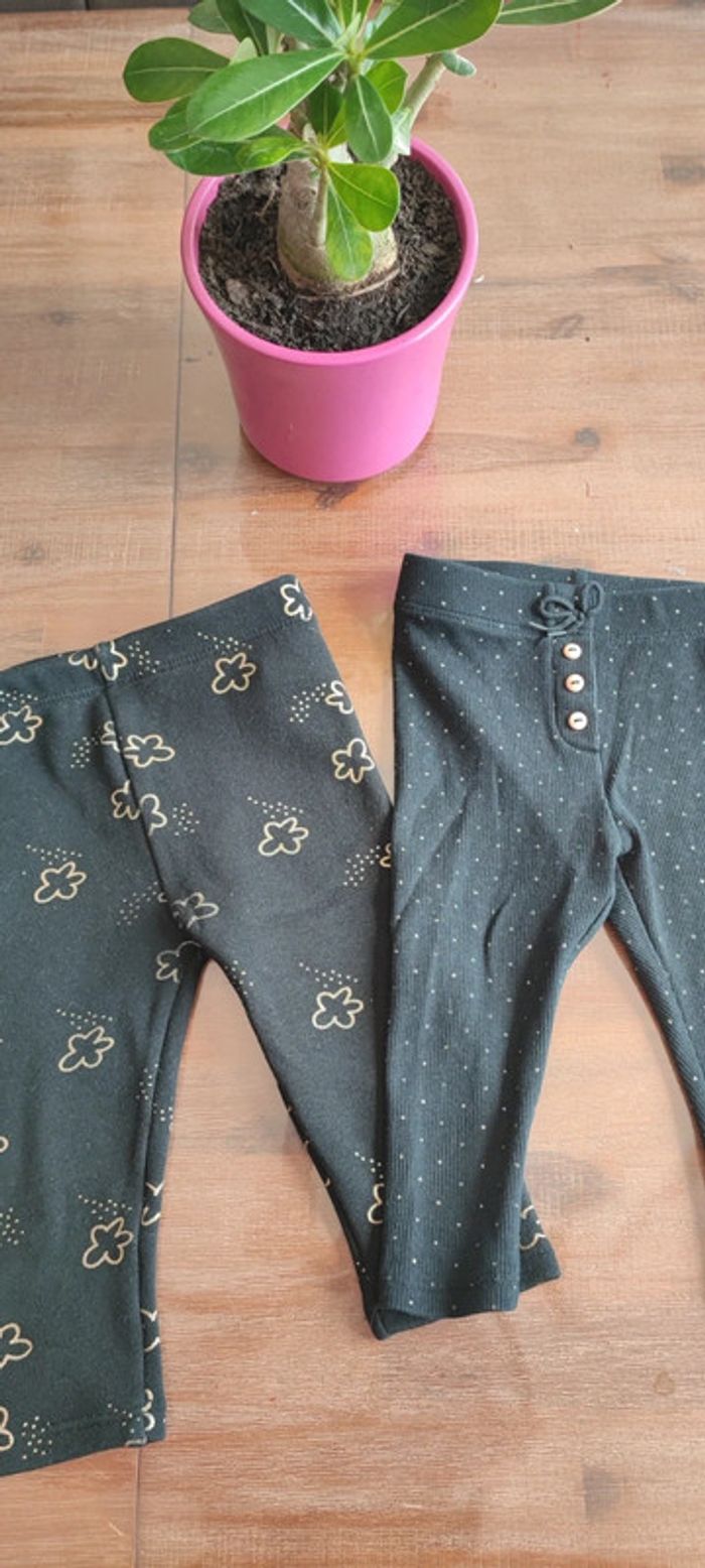Lot de 2 leggings Noirs Un légèrement côtelé, petits pois dorés, marque Kiabi Un légèrement polaire a l'intérieur, motif fleurs or, marque Orchestra Taille 12 mois Bon état Envoi rapide #cyboulette44fille12mois