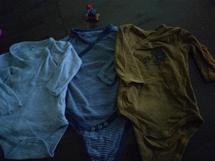 Lot de 3 bodies manches longues Ouverture par pressions devant 2 Kiabi rayés (bleu et gris clair) et 1 Tape a l'œil jaune moutarde Taille 3 mois Très peu portés Peuvent être mixtes #cyboulette44garcon3mois