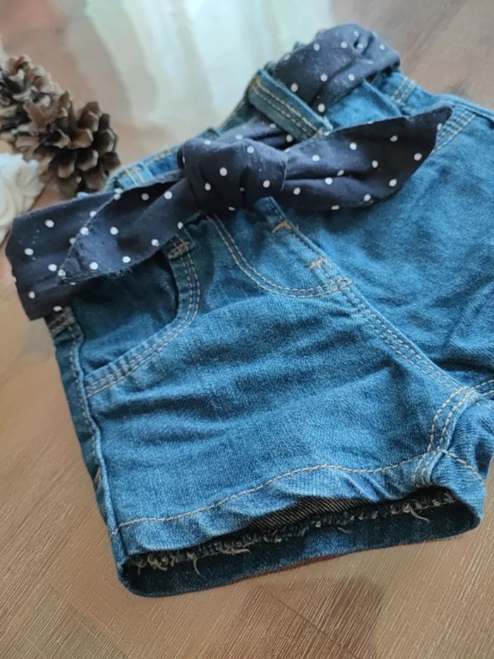 Petit short en jean bleu Avec ceinture tissu marine a pois blanc, à nouer devant Porté 1 fois, état neuf Marque Kiabi, taille 3 mois 56/62cms #cyboulette44fille3mois