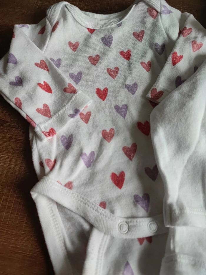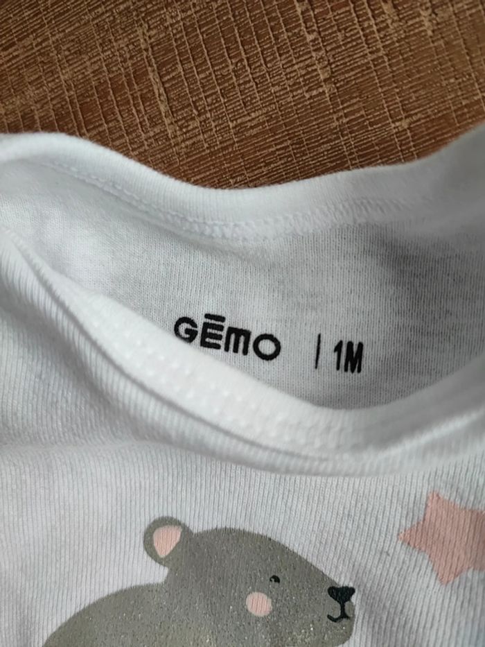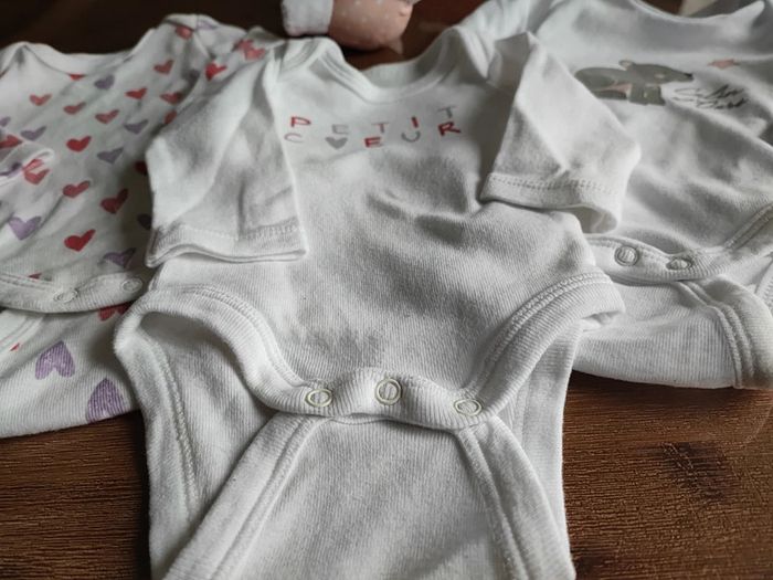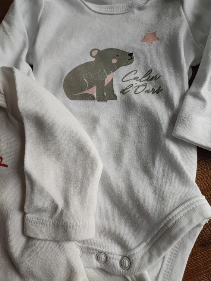 3 bodies blancs taille 1 mois, marque Gémo 2 portés 3 fois chacun et 1 neuf juste lavé Motifs petits coeurs, inscription Petit coeur ou Câlin d'ours, taille 1 mois #cyboulette44fille1mois