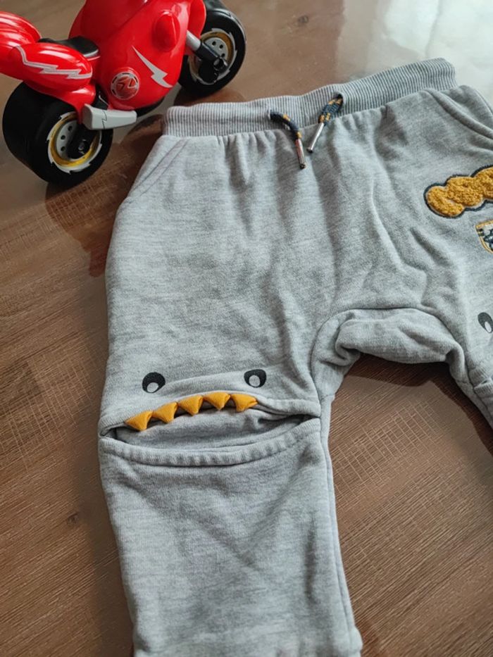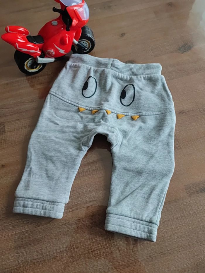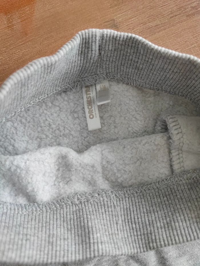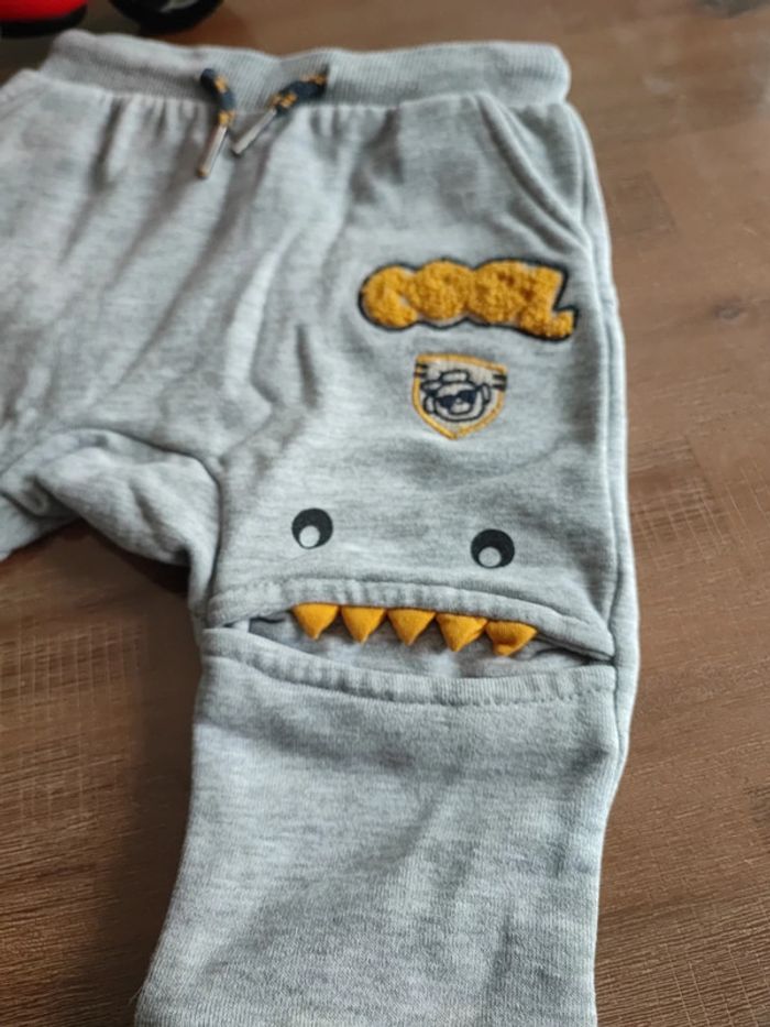 Joli bas de jogging gris clair, avec motif originaux jaune moutarde sur genoux et fesses, peu porté, marque orchestra, taille 6mois 67cms #cyboulette44garcon6mois
