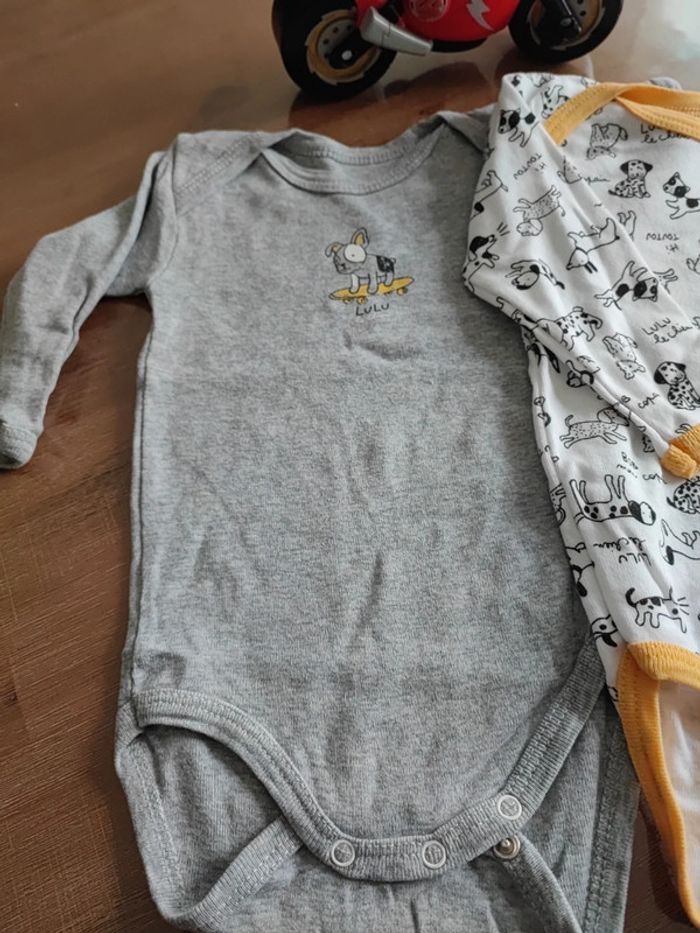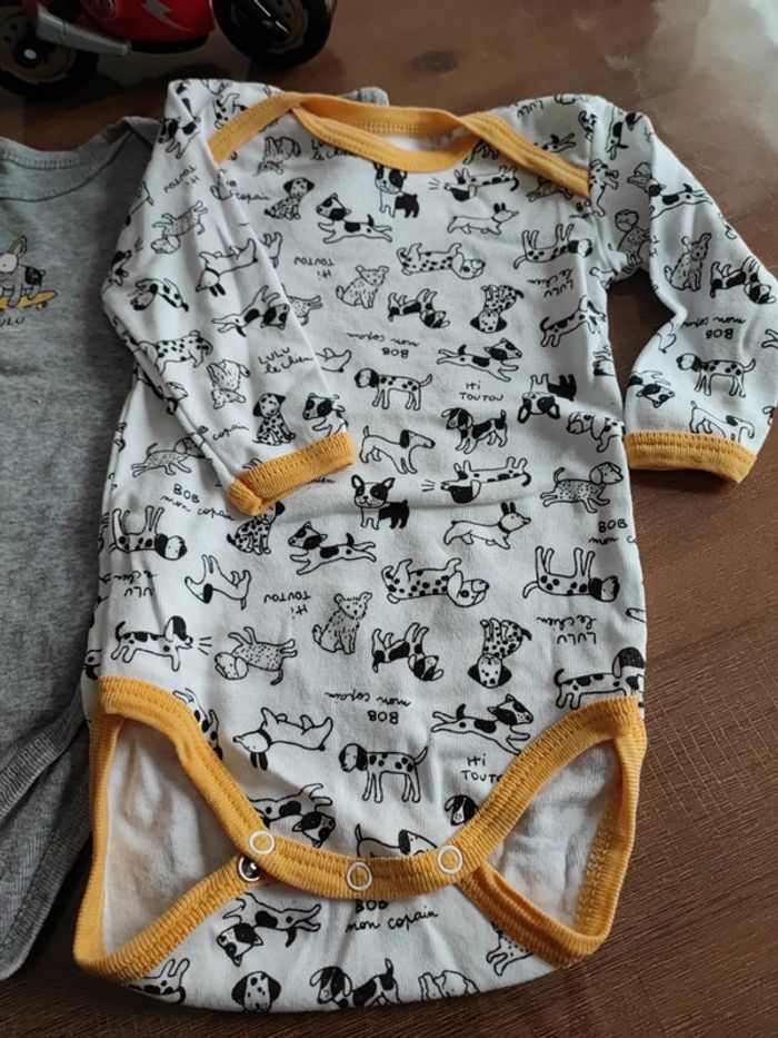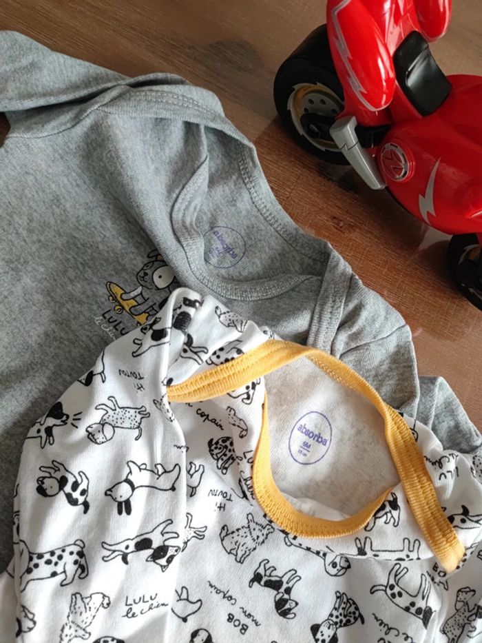 2 bodies manches longues, collection Lulu et bon les chiens, un gris et un blanc a motifs chiens avec bandes jaunes, peu portés, bon état, marque absorba, taille 6 mois 68 cms #cyboulette44garcon6mois