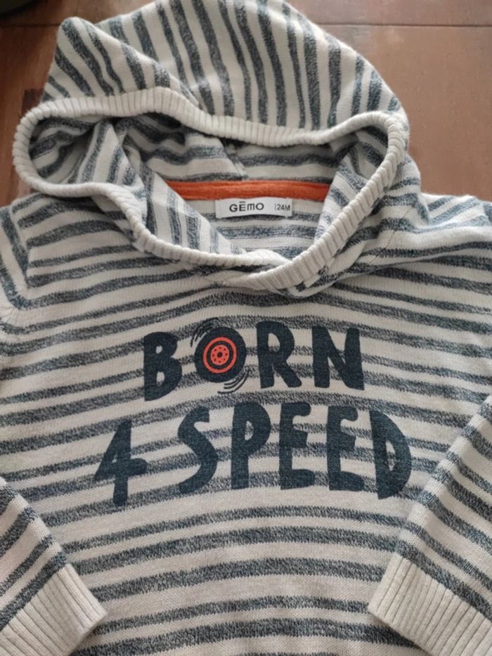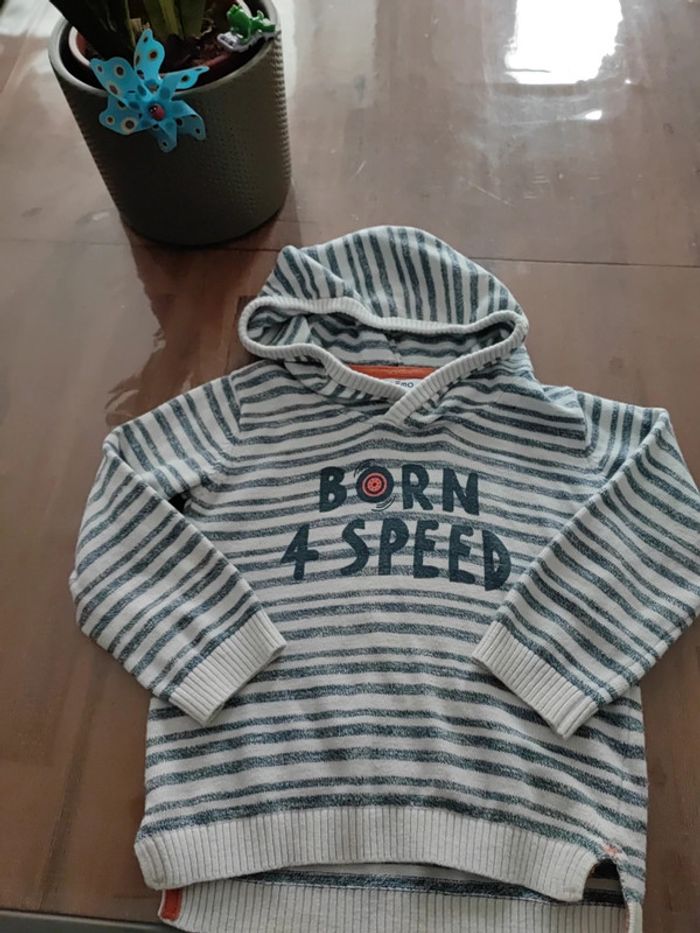 Pull à capuche, beige rayé bleu chiné, inscription Born 4 speed, bonne coupe, peu porté, 24mois #cyboulette44garcon24mois