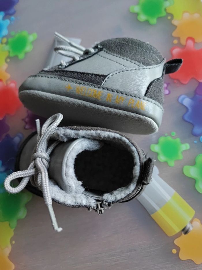 Baskets bébé, semelle souple, taille 3/6mois, montantes, lacets + fermeture éclair, gris et gris foncé, intérieur moumoute, inscription welcome in my plane, très bon état, peu portées #cyboulette44chaussuresenfant