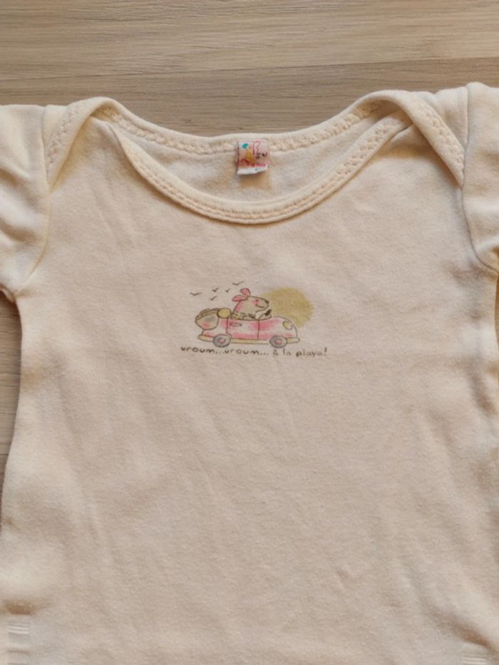 Porté plusieurs fois. Une petite tâche a l'intérieur d'un body blanc. Le dernier body est noté 18 mois mais taille petit