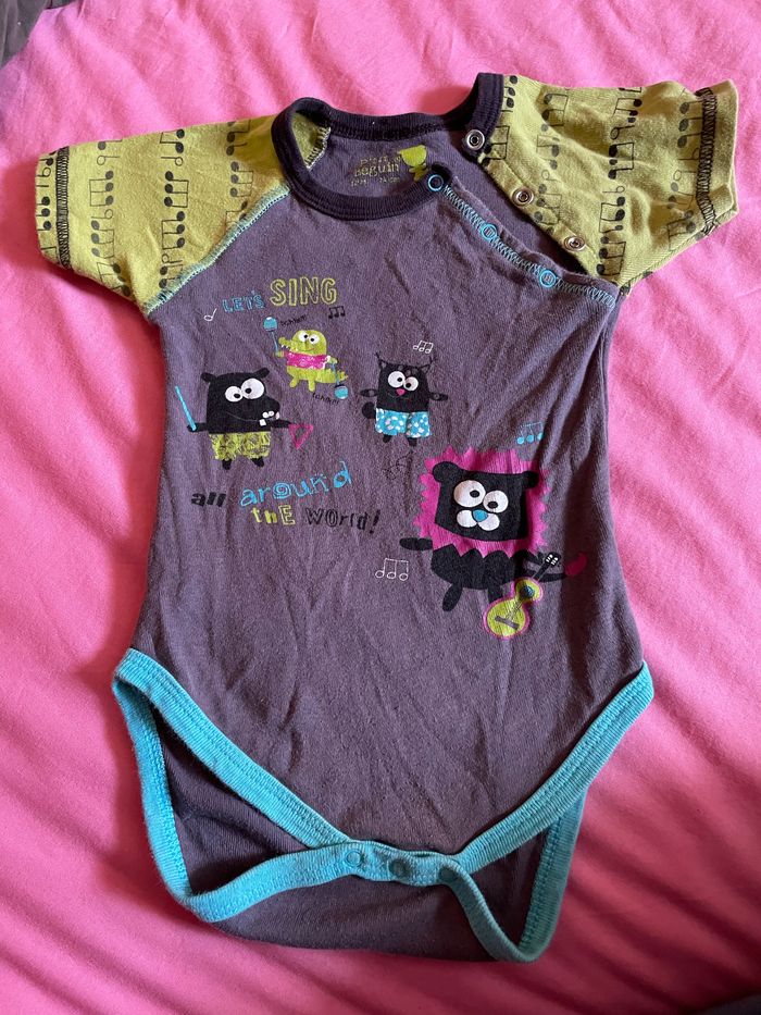 Bodie fille 12 mois Pressions en bas et à l épaule Manches courtes Couleur : marron avec motifs Manches : couleur pistache 12 mois Marque P’tit Béguin