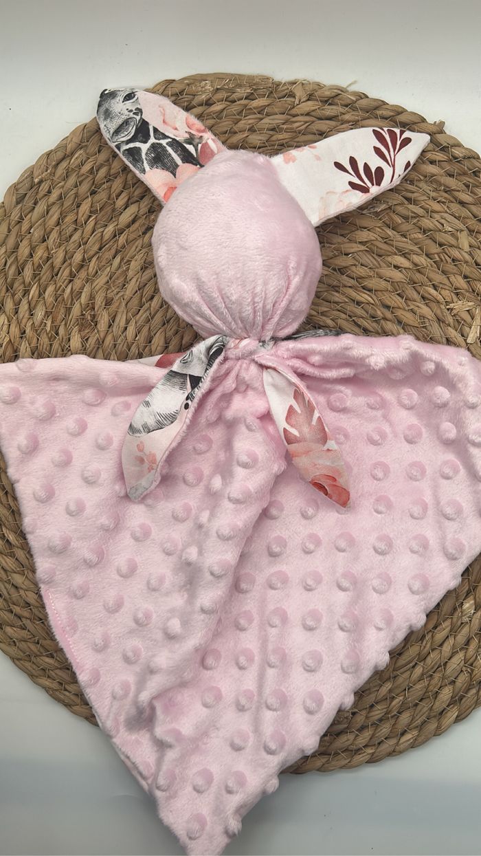 Doudou lapin Fait entièrement main par mes soins En minky coton Possible de broder le prénom ( +3€) Prix de base 8,50€ Couleurs blanc rose gris Motifs animaux savane Autres tissus et créations disponibles sur demande