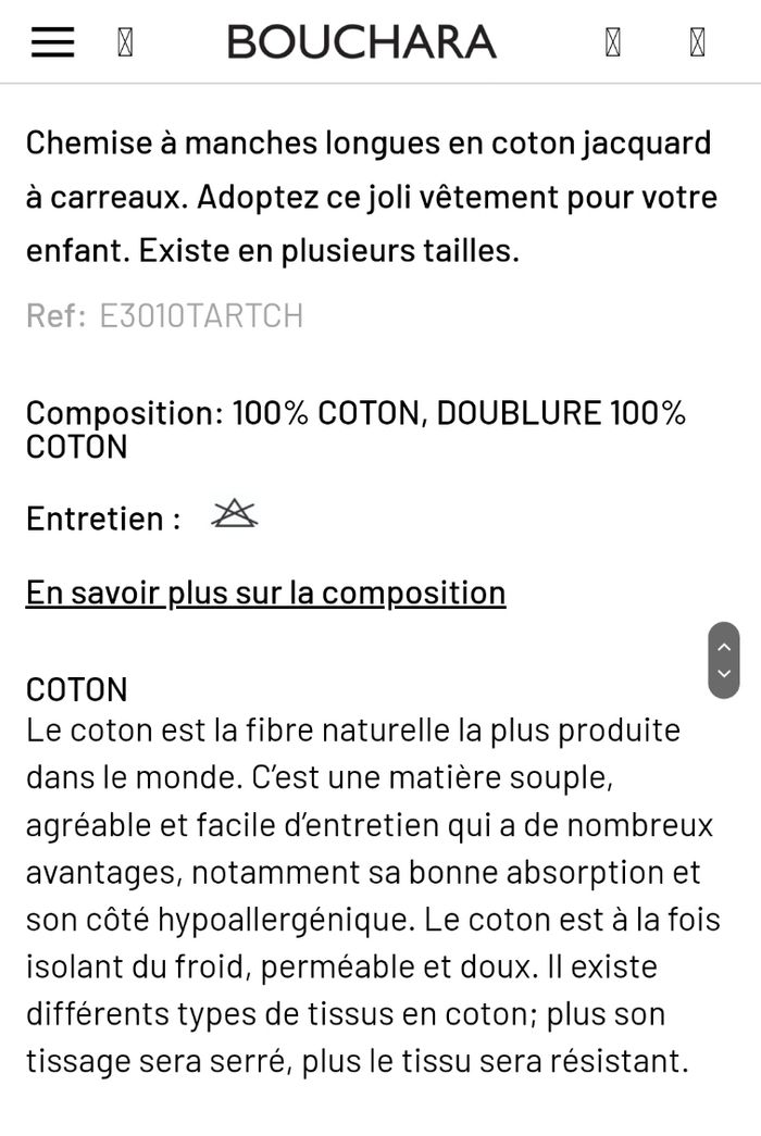 Article neuf, jamais porté, juste lavé 18 mois De chez Bouchara Chemise à manches longues en coton jacquard à carreaux. Adoptez ce joli vêtement pour votre enfant. Existe en plusieurs tailles. Ref E3010TARTCH Composition: 100% COTON, DOUBLURE 100% COTON Le coton est la fibre naturelle la plus produite dans le monde. C’est une matière souple, agréable et facile d’entretien qui a de nombreux avantages, notamment sa bonne absorption et son côté hypoallergénique. Le coton est à la fois isolant du froid, perméable et doux. Il existe différents types de tissus en coton; plus son tissage sera serré, plus le tissu sera résistant