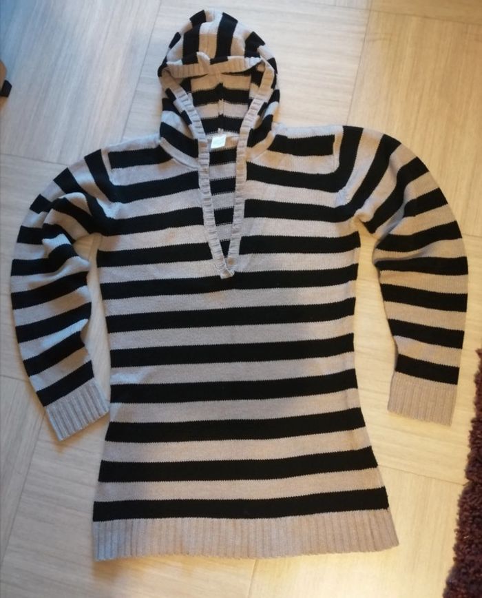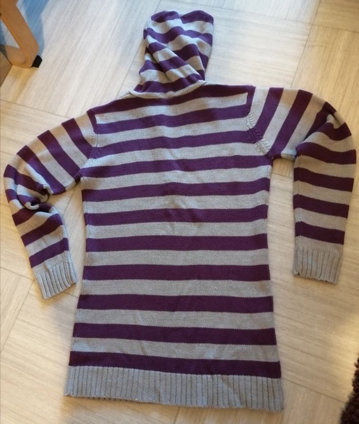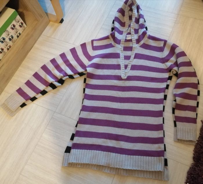 Lot de 2 pulls à capuche. 14/16 ans 1 gris/noir en taille 168 cm il fait 73 cm de long (hors capuche) 1 gris/violet en taille 162 cm il fait 70 cm de long (hors capuche) Comme on peut le voir sur la dernière photo il n'y a pas grande différence de taille. Ils sont en très bon état. 100 % acrylique.