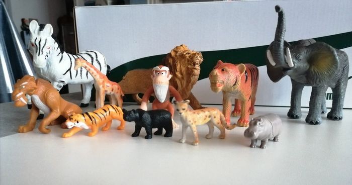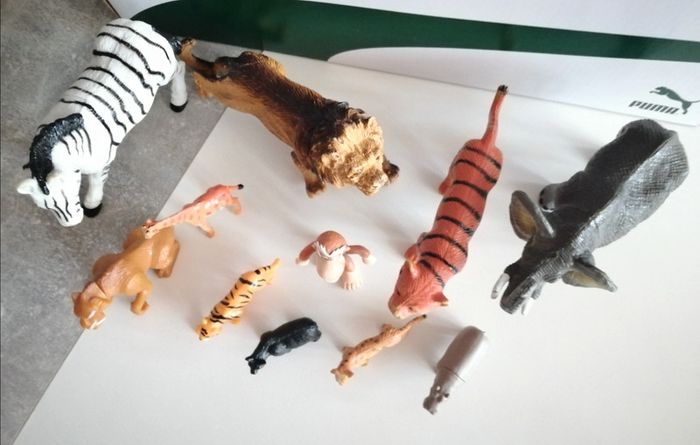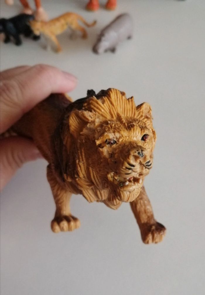Lot de 11 figurines animaux sur le thème de la savane. Tous en très bon état hors mis le lion qui a probablement été mordiller par le chien... Mais rien de méchant et finalement ça lui donne vraiment un air sauvage 😅