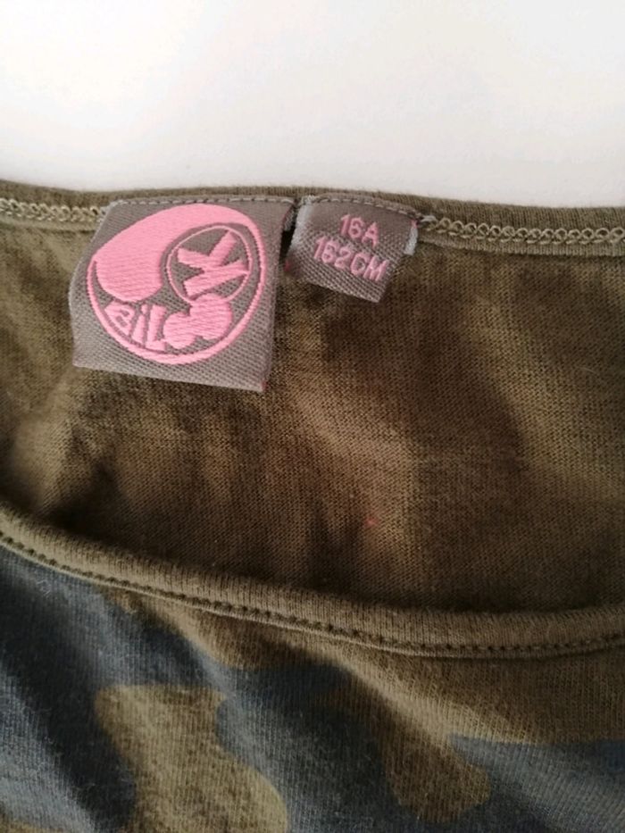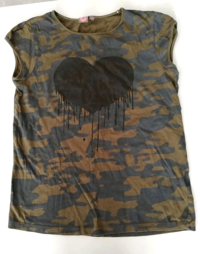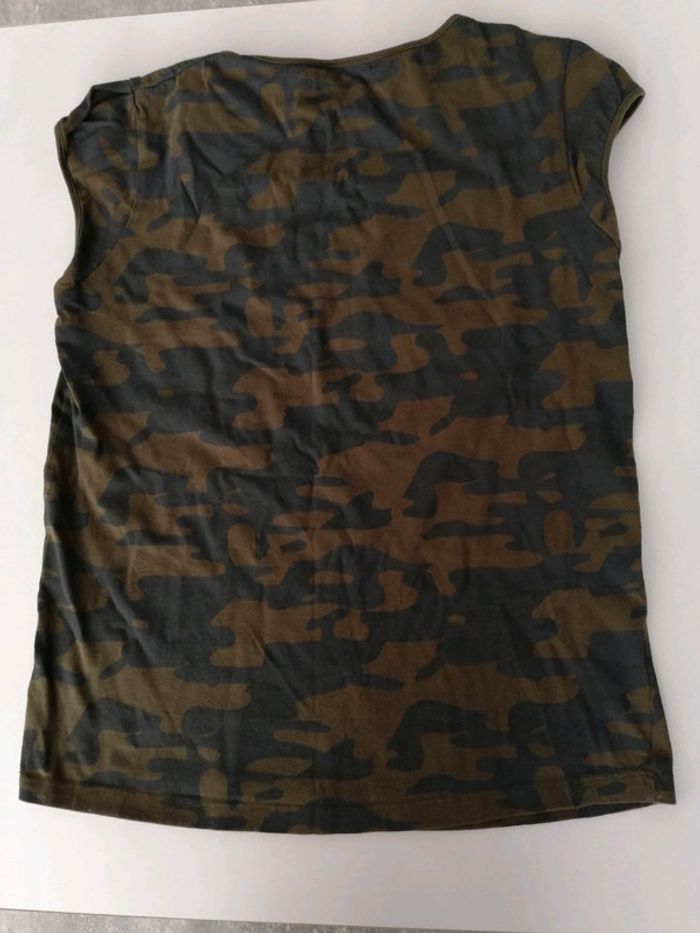 Tee-shirt, imprimé militaire. Taille 16 ans mais peut aussi convenir à un 14 ans. Très bon état, juste besoin d'un coup de repassage (je n'ai pas de fer 😐)