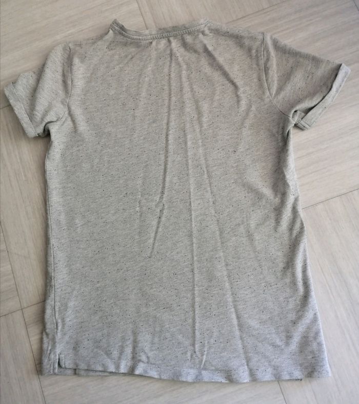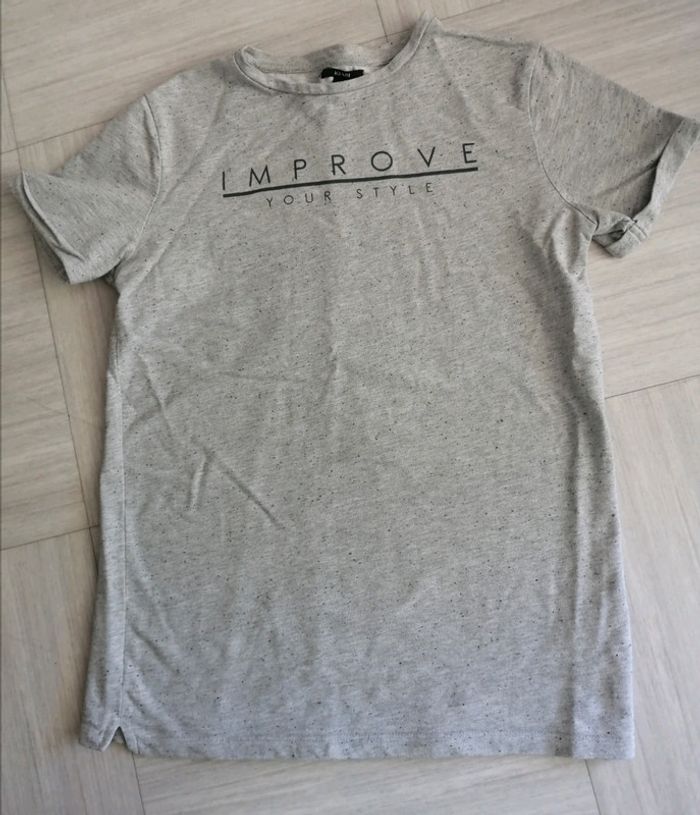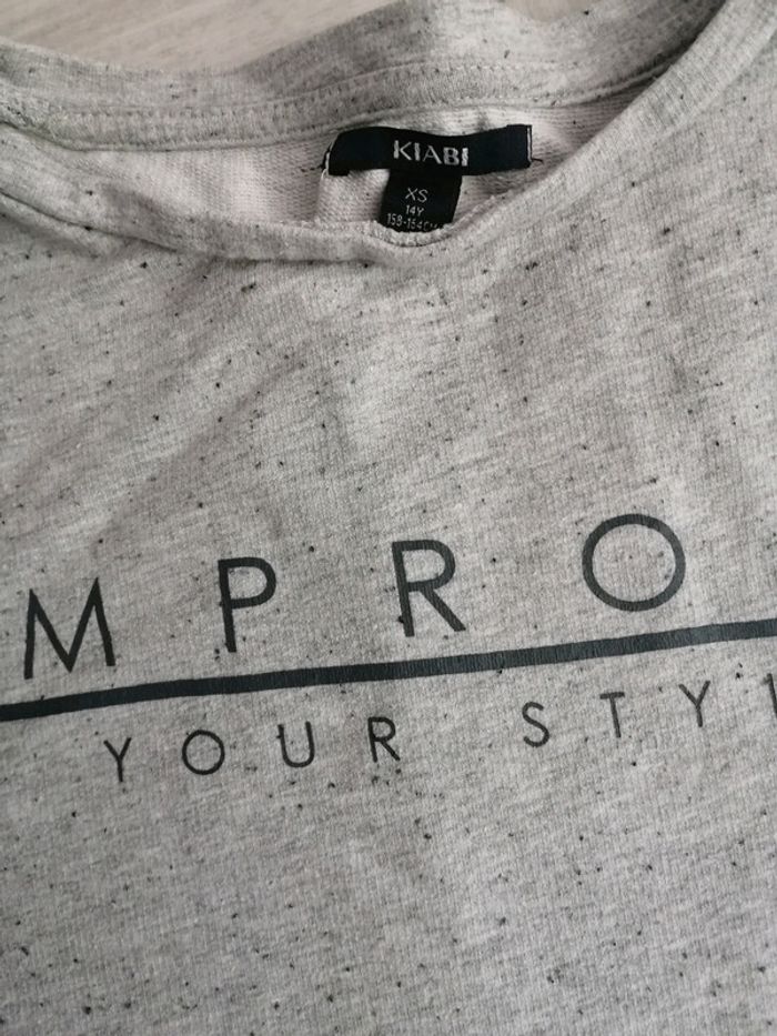 Pull pas épais à manches courtes, environ 67 cm de long. Taille 14 ans (158-164 cm) Couleur gris clair chiné. 94% coton 5 % viscose 1% polyester Très bon état, à juste besoin d'un coup de repassage (dsl je n'ai pas de fer).