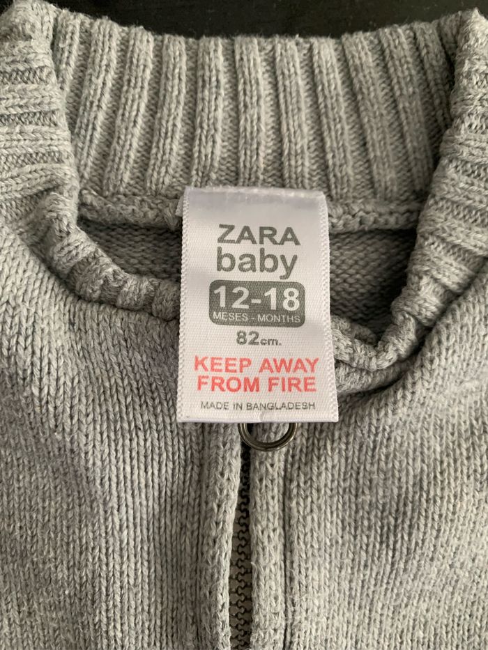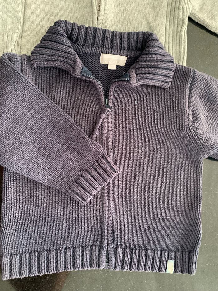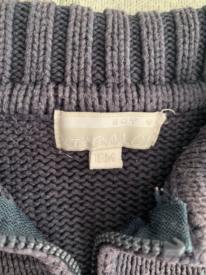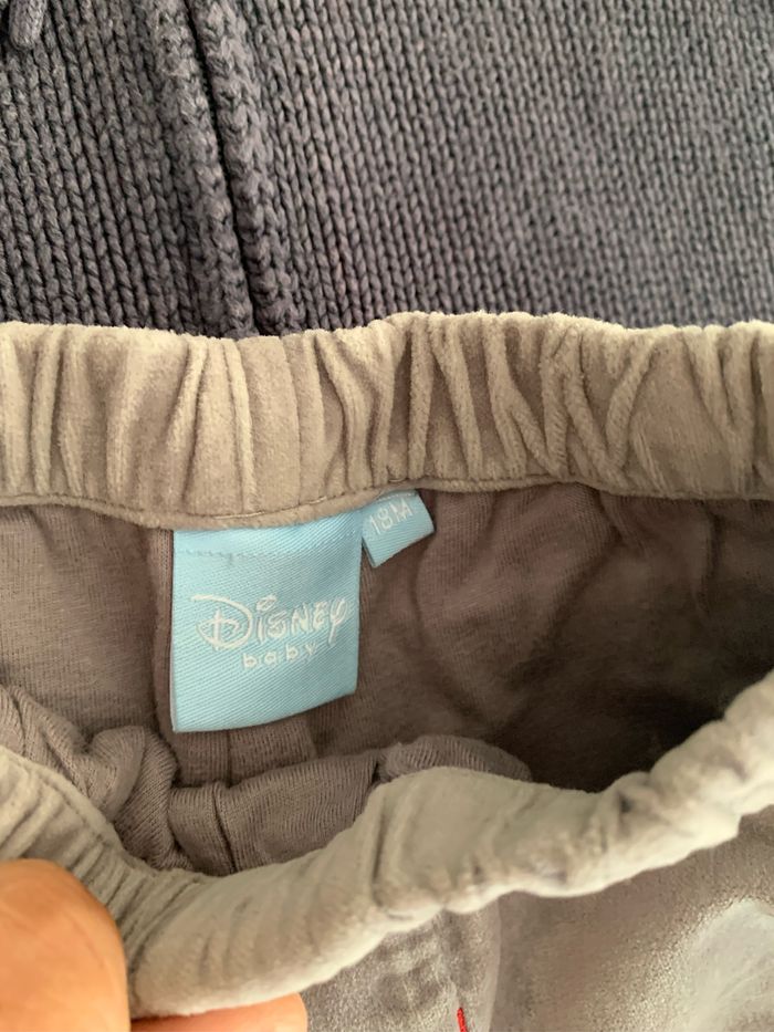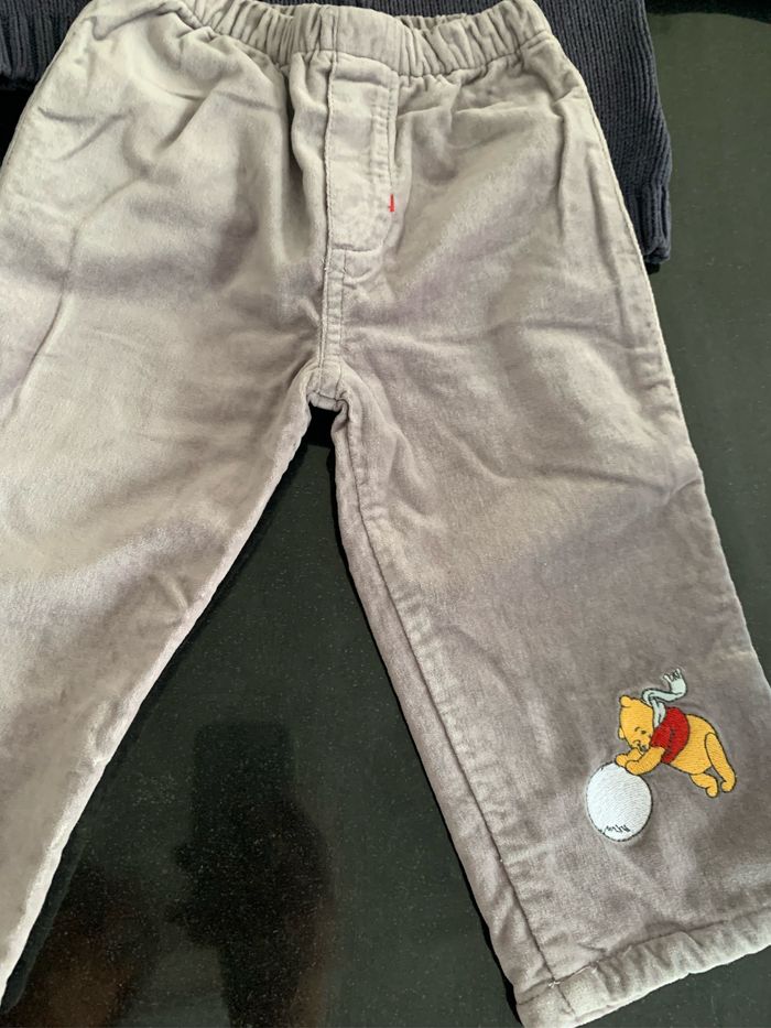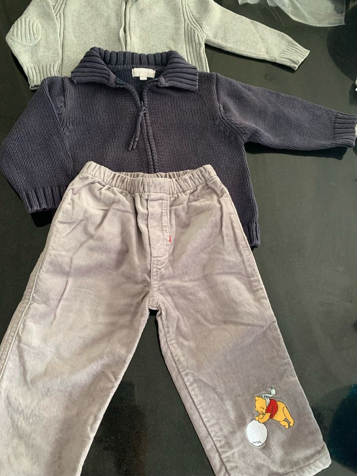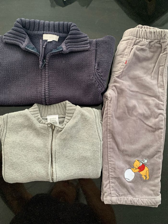 Lot comprenant un pantalon Winnie, l’ourson chaud, 18 mois, un gilet Zara 12 18 mois gris clair , un autre gilet zippé Kimbalou bleu marine effet vieilli 18 mois,