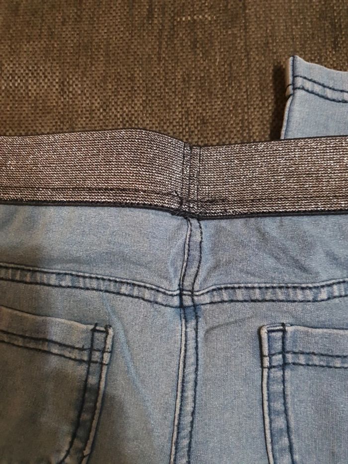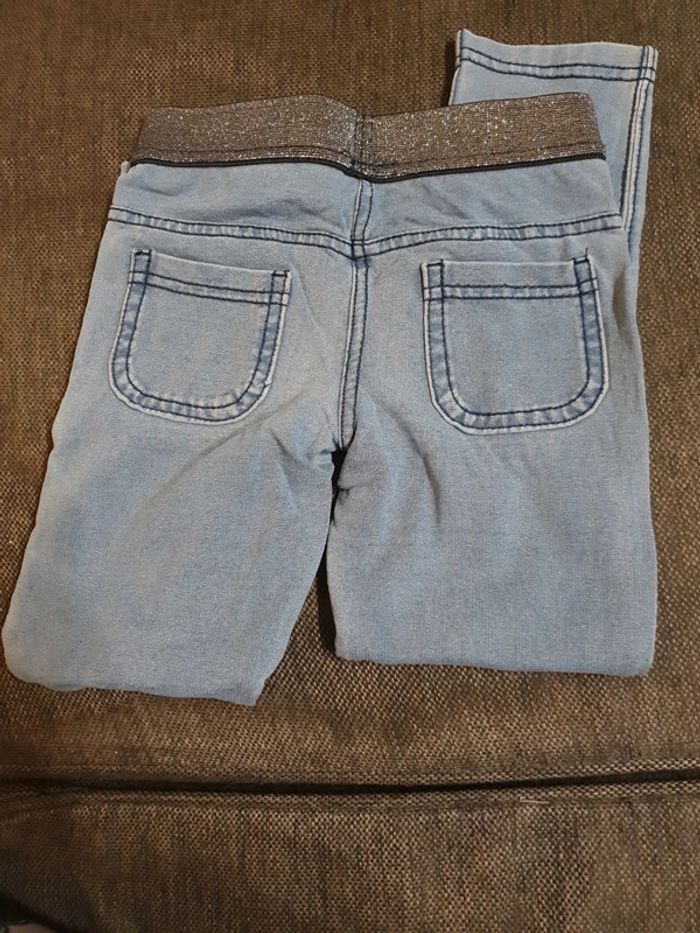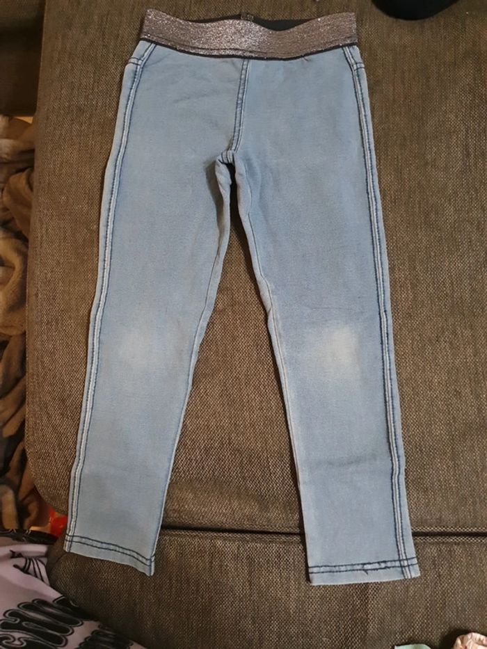 Pantalon streche imitation jeans couleur bleu clair. 2 poches a l arrière. Élastique a la taille couleur argenté brillant. Peu porté. Coupe droite. #5ansvalco8572