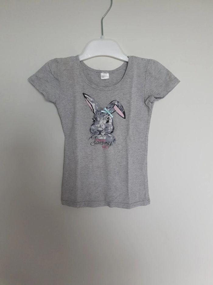 Tee-shirt gris cintré avec dessin tete de lapine avec petit noeud. 98/104 cm. #4ansvalco8572