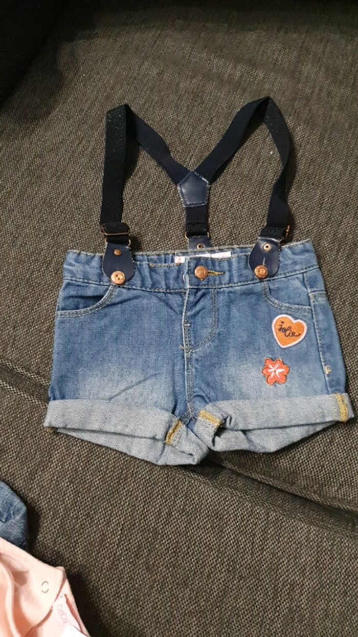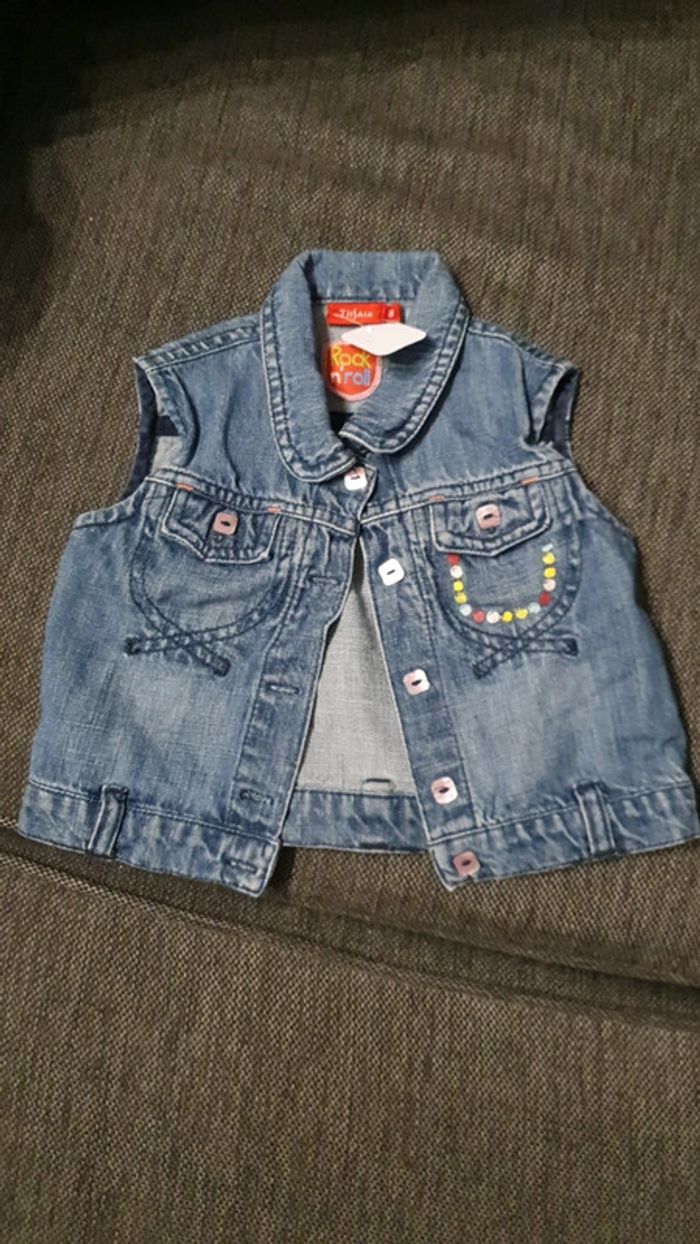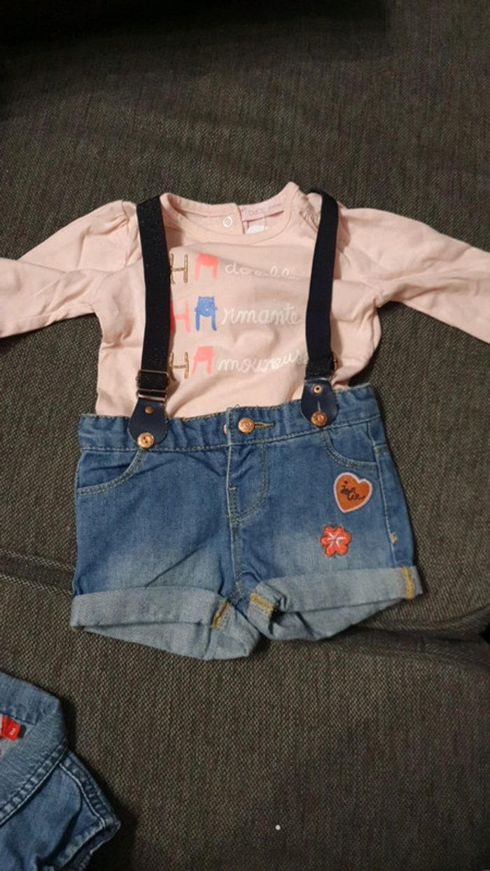 Ensemble 6 mois, short jeans et tee-shirt bouton tout le long du dos. J ai rajouté la petite veste en jean sans manche.
