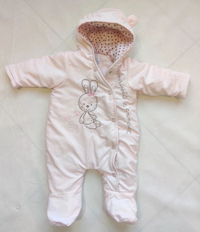Combinaison rose poudrée d'hiver avec pied en excellent état de la marque Petit Kimbaloo. Fermeture par pression, intérieur polaire. Motif lapin. Taille 6 mois #fille6moissteph77230