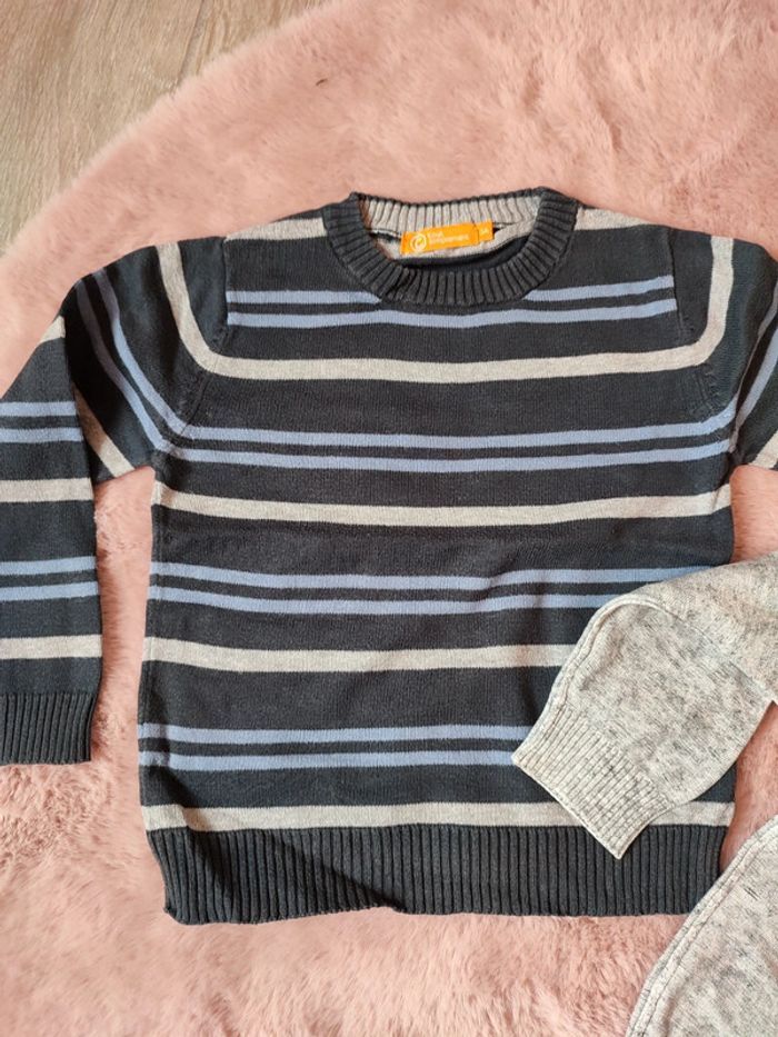 Lot 2 pulls 1 avec rayures 1 gris, comporte une légère tâche sur le coude a l'arrière 3 ans