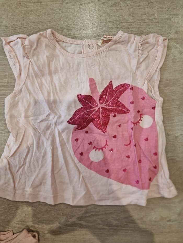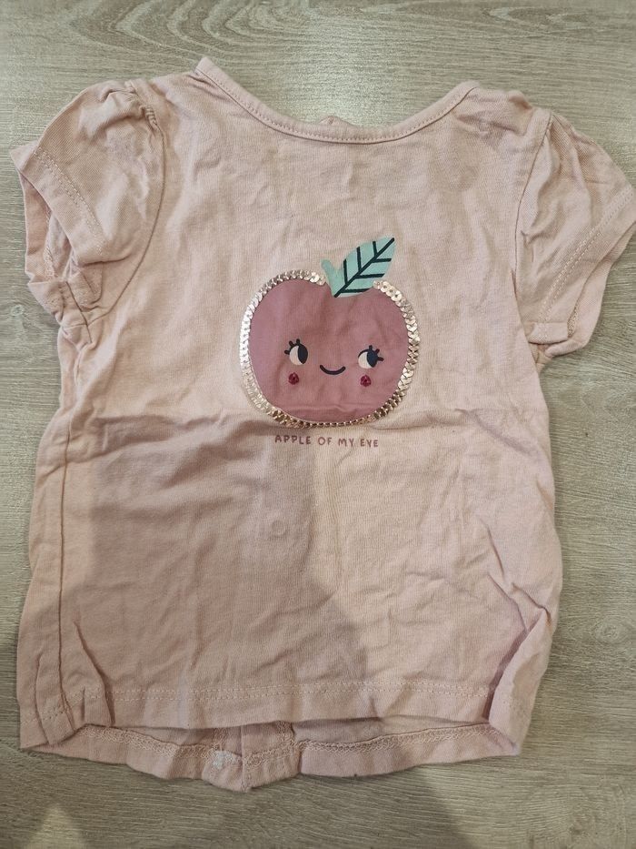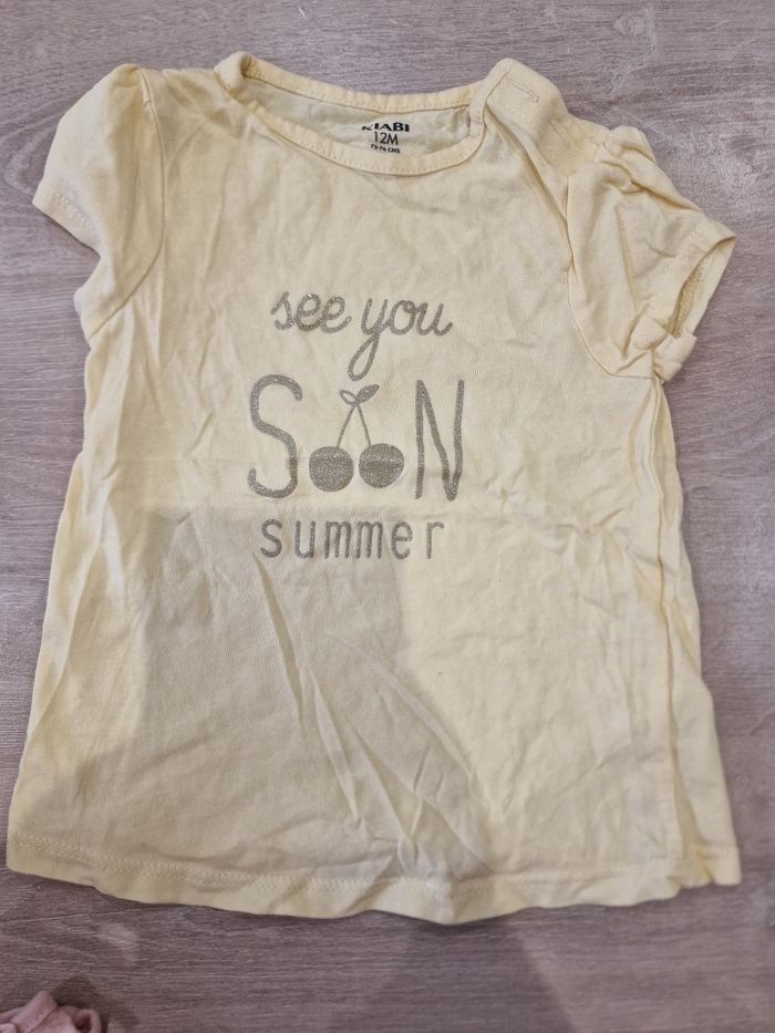 Lot de 5 tee-shirts filles 9/ 12 mois 1 rose 9/12mois de la marque MissCutte 1 jaune avec écriture de la marque kiabi 12mois 1 rose et blanc rayer de la marque kiabi 12 mois 1 rose/ beige avec pomme de la marque kiabi 12mois 1 rose avec dessin fraise de la marque du pareil au même 9 mois Tous en bon état.