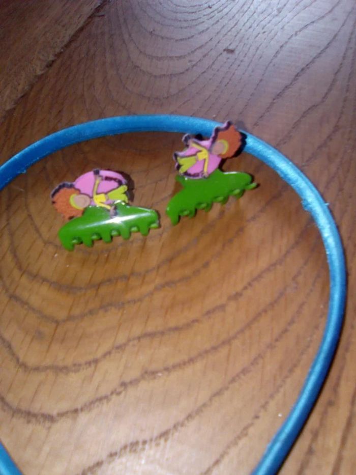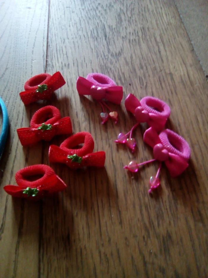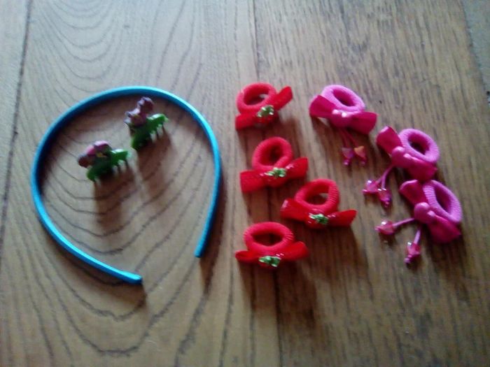 Accessoires pour cheveux ensemble composé de Élastiques rouges fraise Élastiques rose coeur Serre tête bleu Pinces vertes fille #pincesfille #elastiques #accessoirescheveux #serretête