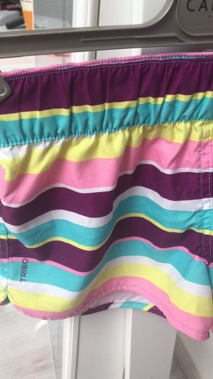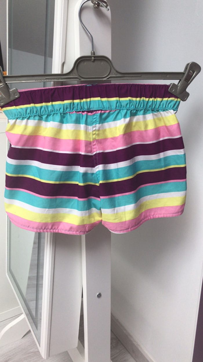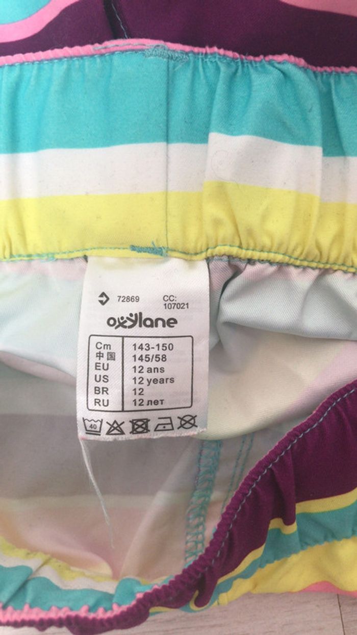 Short de bain rayé Oxylane de couleurs violet,rose,jaune,blanc et bleu turquoise avec élastique à la taille, pour du 12 ans , en bon état