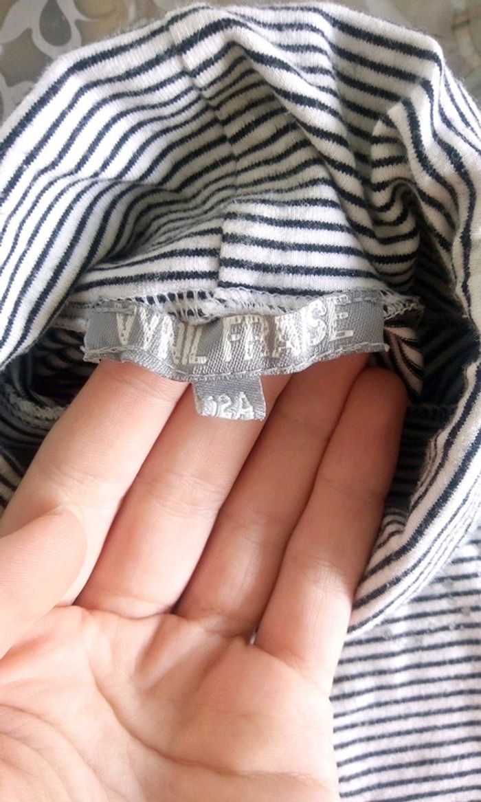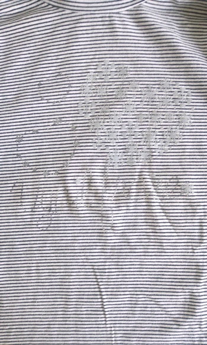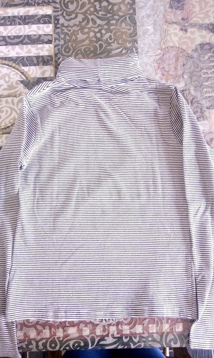 T-shirt à manche longue blanc avec des rayures noir et un col rouler , taille 12 ans et un dessin argenté sur le devant du t-shirt , marque vynil fraise