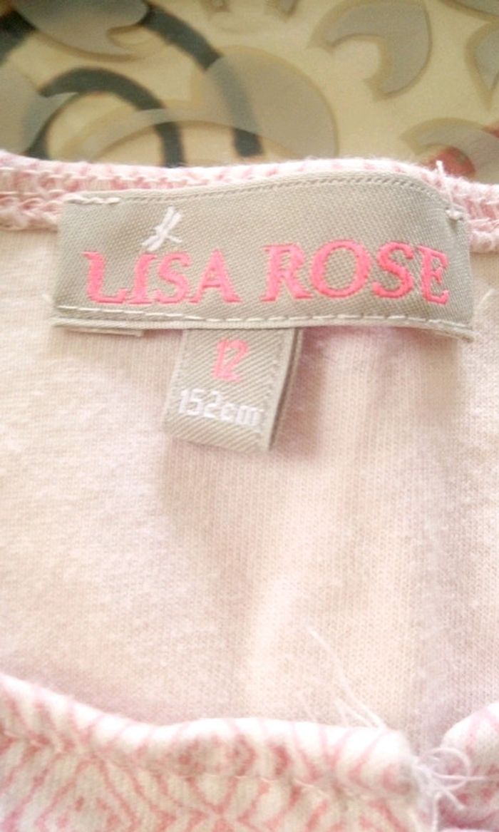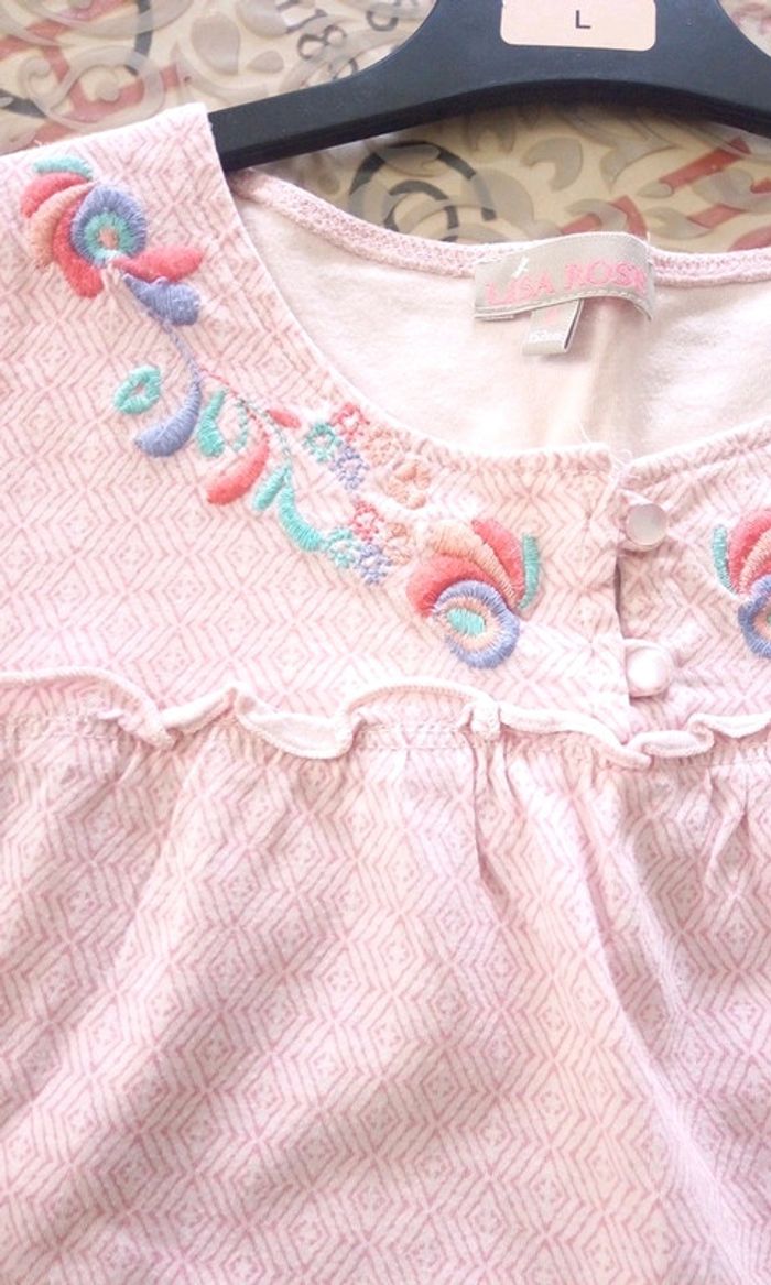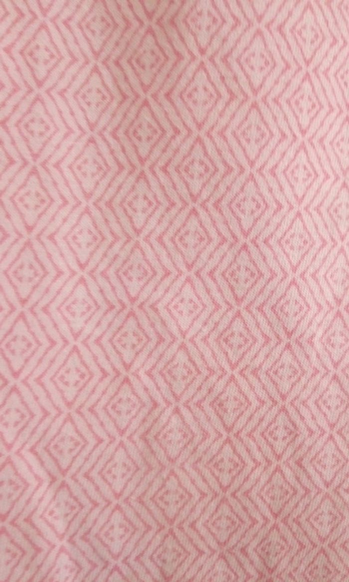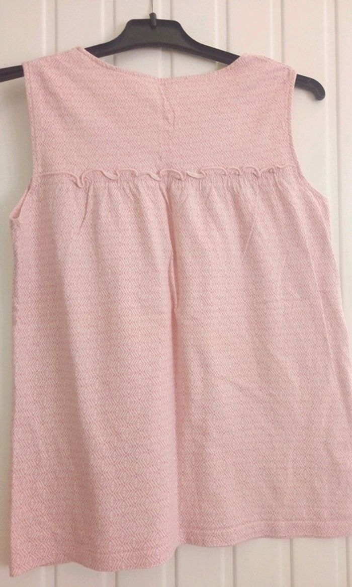 Débardeur d'été rose et blanc avec des motifs en forme de losanges , en haut il y a des broderies de plusieurs couleurs , taille 12 ans