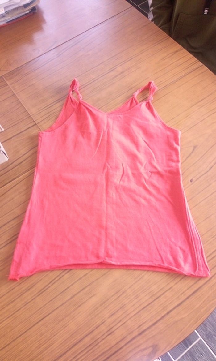 Tee-shirt sans manche ,décoré avec effet retouche et dessin,de couleur rouge clair,un peu corail foncé.en parfait État.