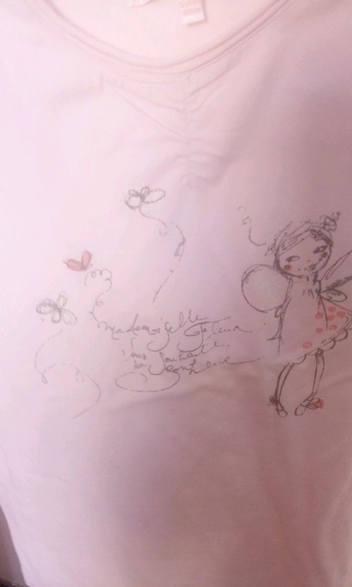 Tee-shirt rode clair avec petite manche en frou frou et dessin devant.noté 12 ans mais qui taille petit pour un 10 ans