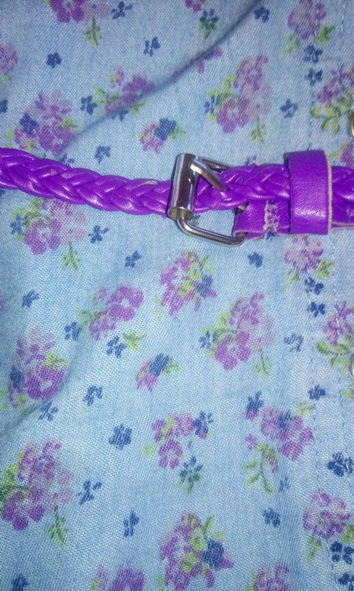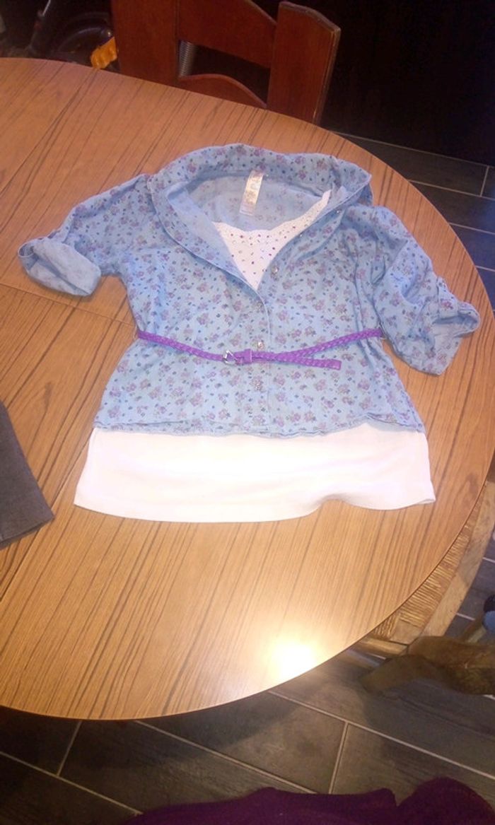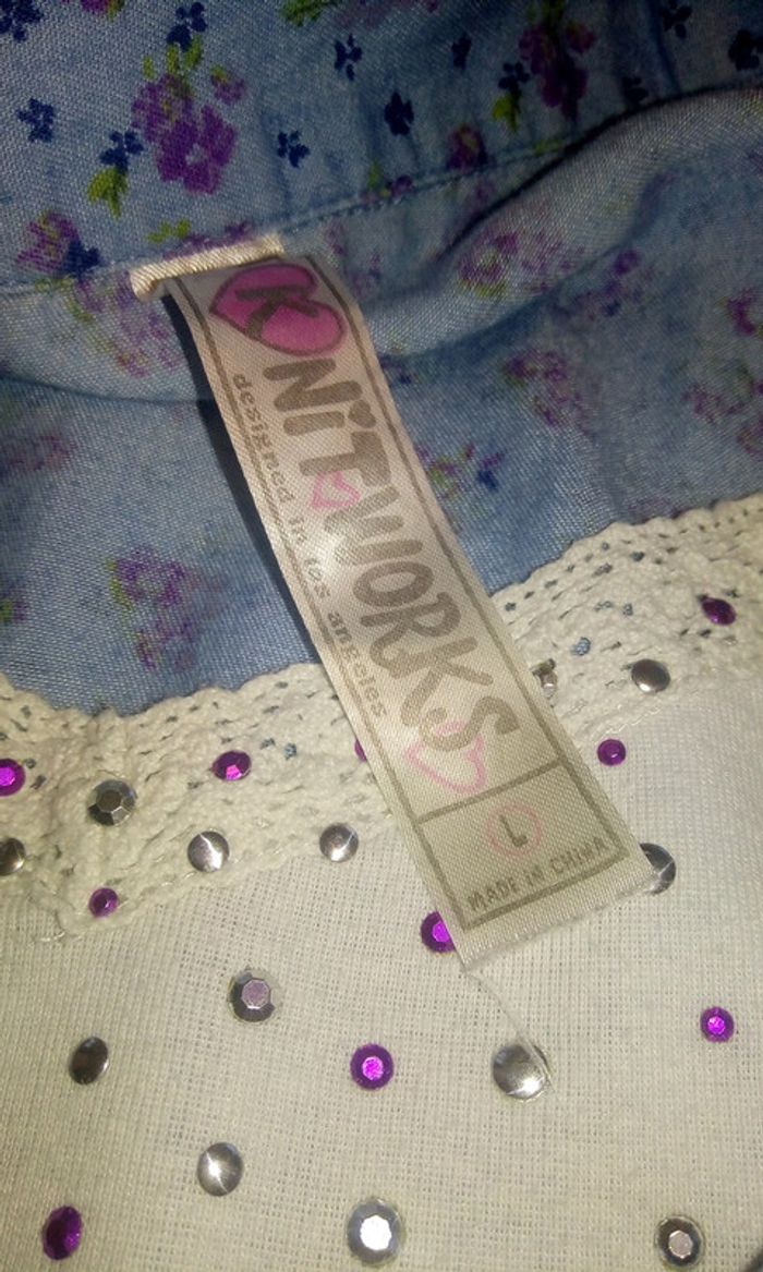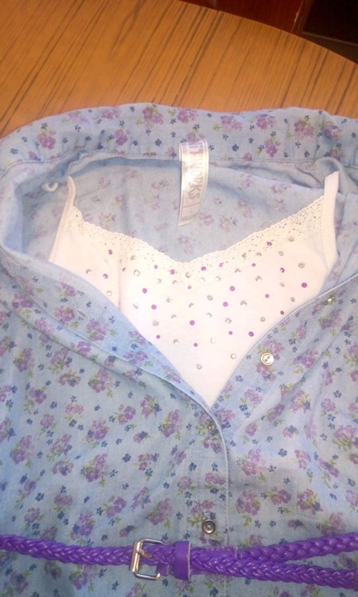 Jolie chemisier bleu clair avec des fleurs en dessin couleur Lilas avec un tee-shirt blanc cassé dessous accroché par les bretelles et avec des brillants.chemise que l'on peut mettre ouverte ou fermer avec une ceinture.il a été acheté au États-Unis et sa taille L correspond à un 10ans .porté mais aucun défaut
