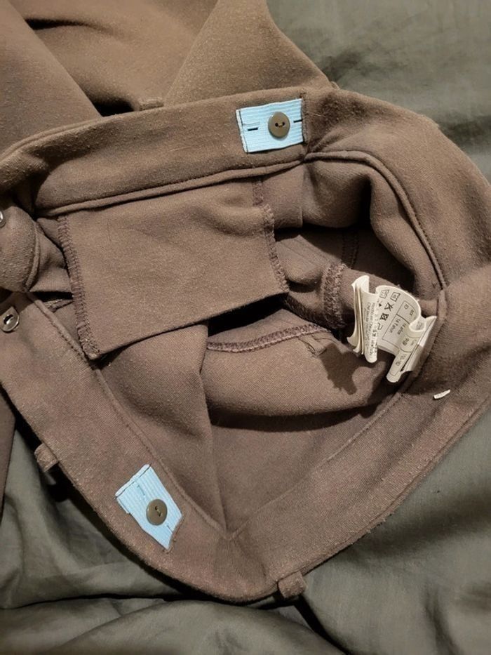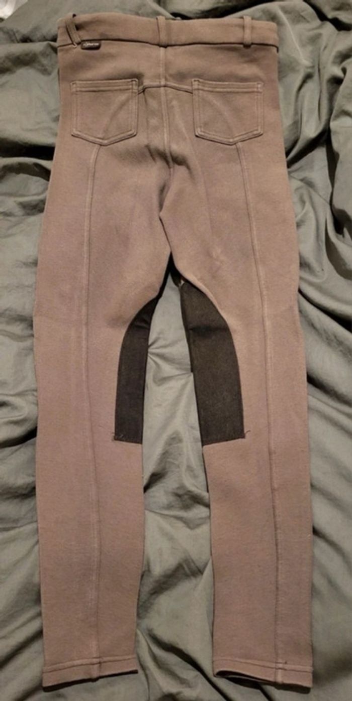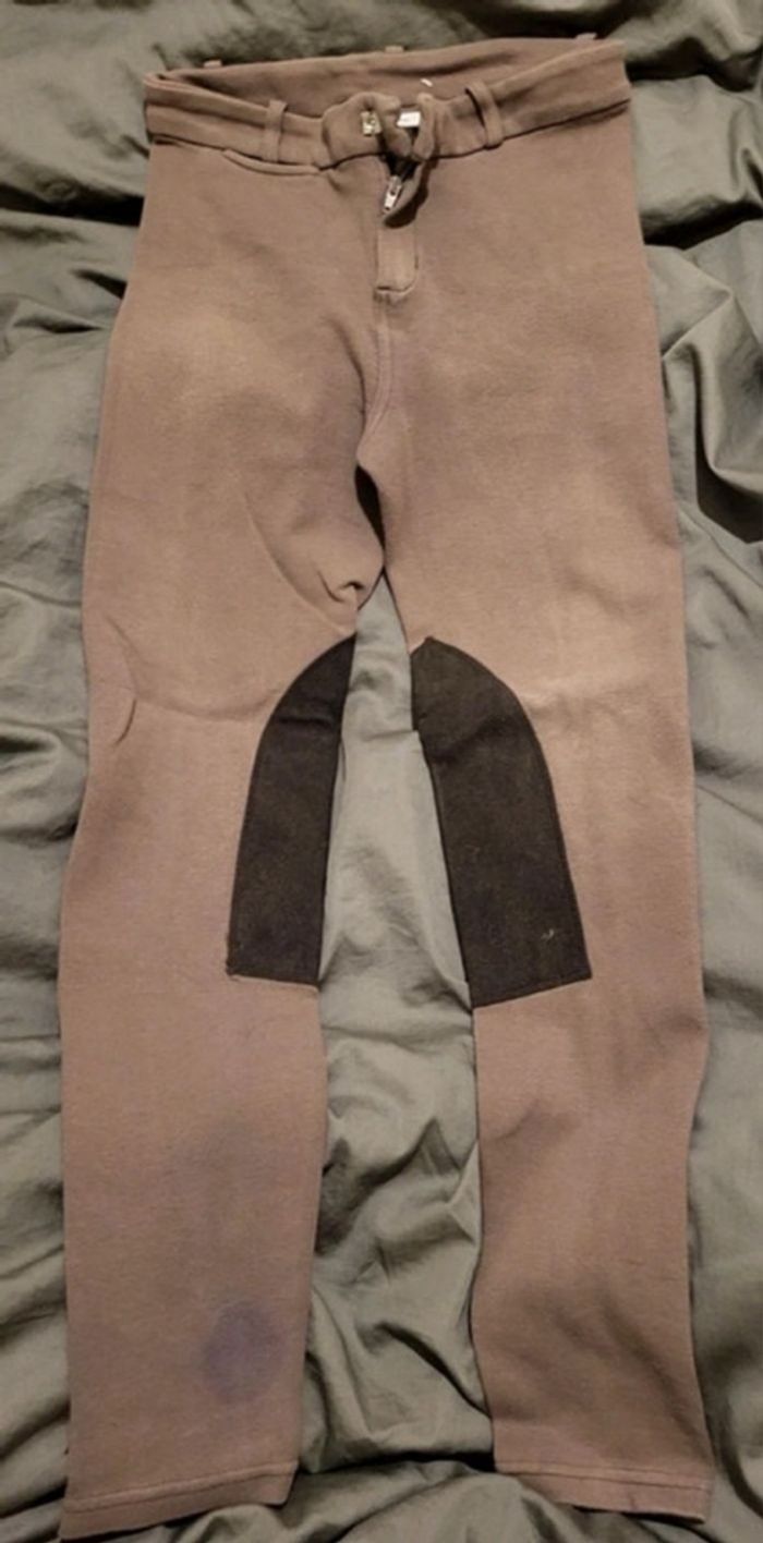 Pantalon de poney / cheval marron Decathlon 14 ans Réglable à la taille. Une tâche en bas de la jambe, ce voit presque pas en vrai, mais ressort bcp en photo. Pantalon légèrement pluché. Très peu mis