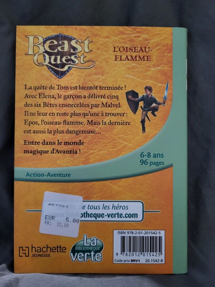 Beast Quest Tome 6 L'oiseau-flamme bibliothèque verte Attention il y a le nom de l'enfant et une date sur la couverture intérieure. Couverture légèrement abîmée (rayée) Sinon intérieur en super état jamais lu #manou0201_livres