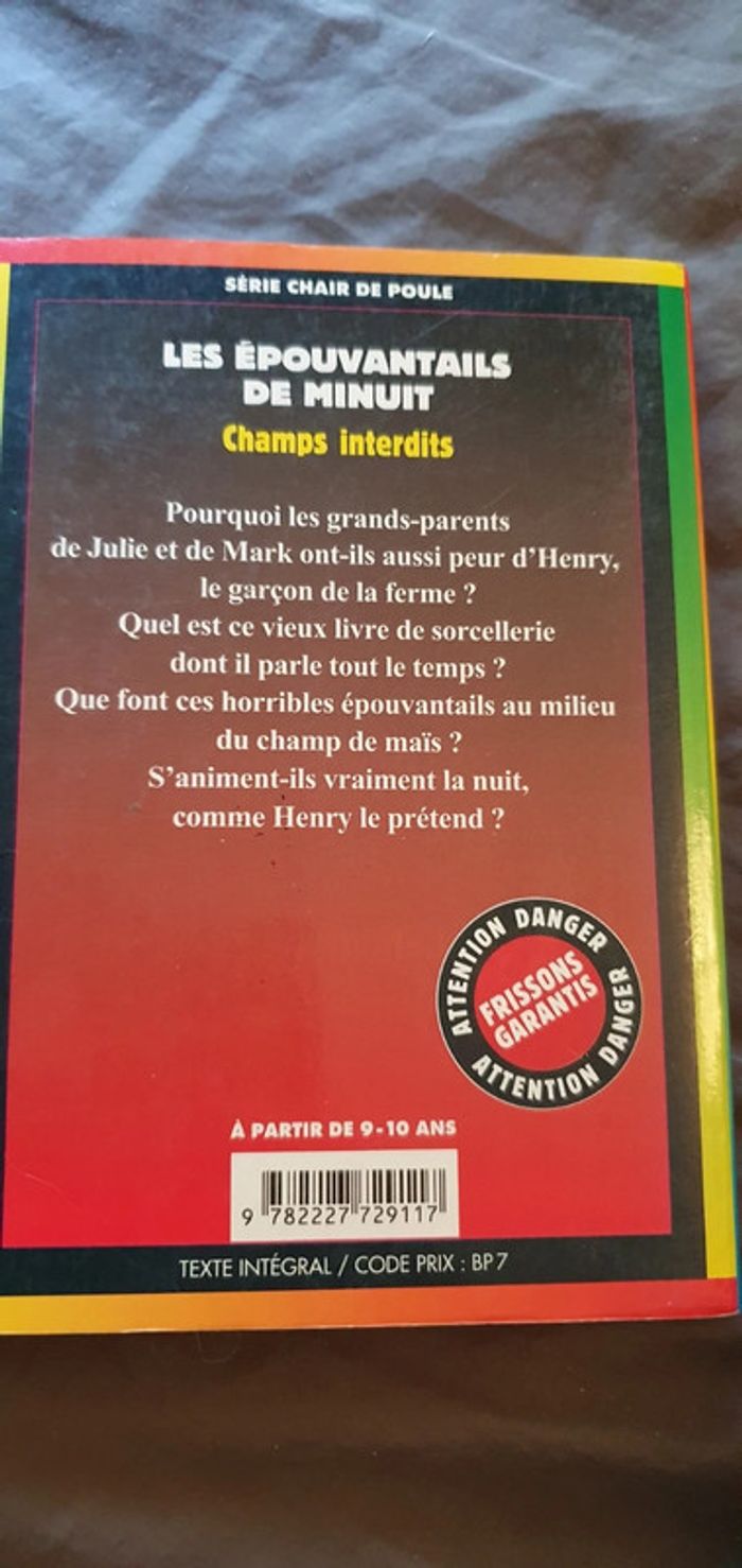 Livre les épouvantails de minuit Série Chair de poule Couverture rayée, et angles abîmés. Lu 1 fois.