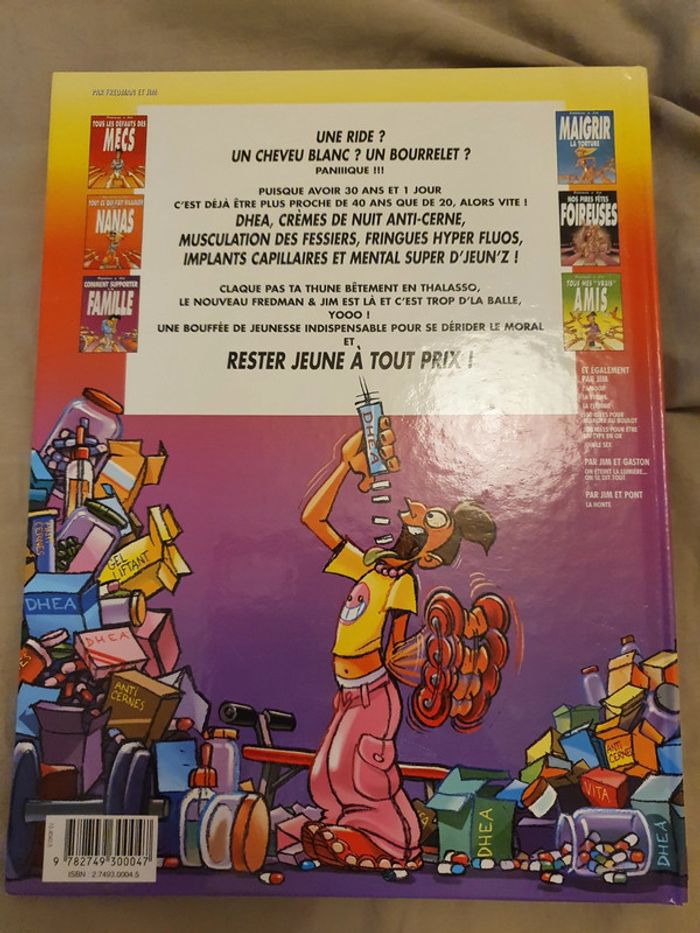 BD Rester jeune à tout prix Couverture rayée, abîmée un peu dans les angles et sur la couverture un coin un peu délavée.