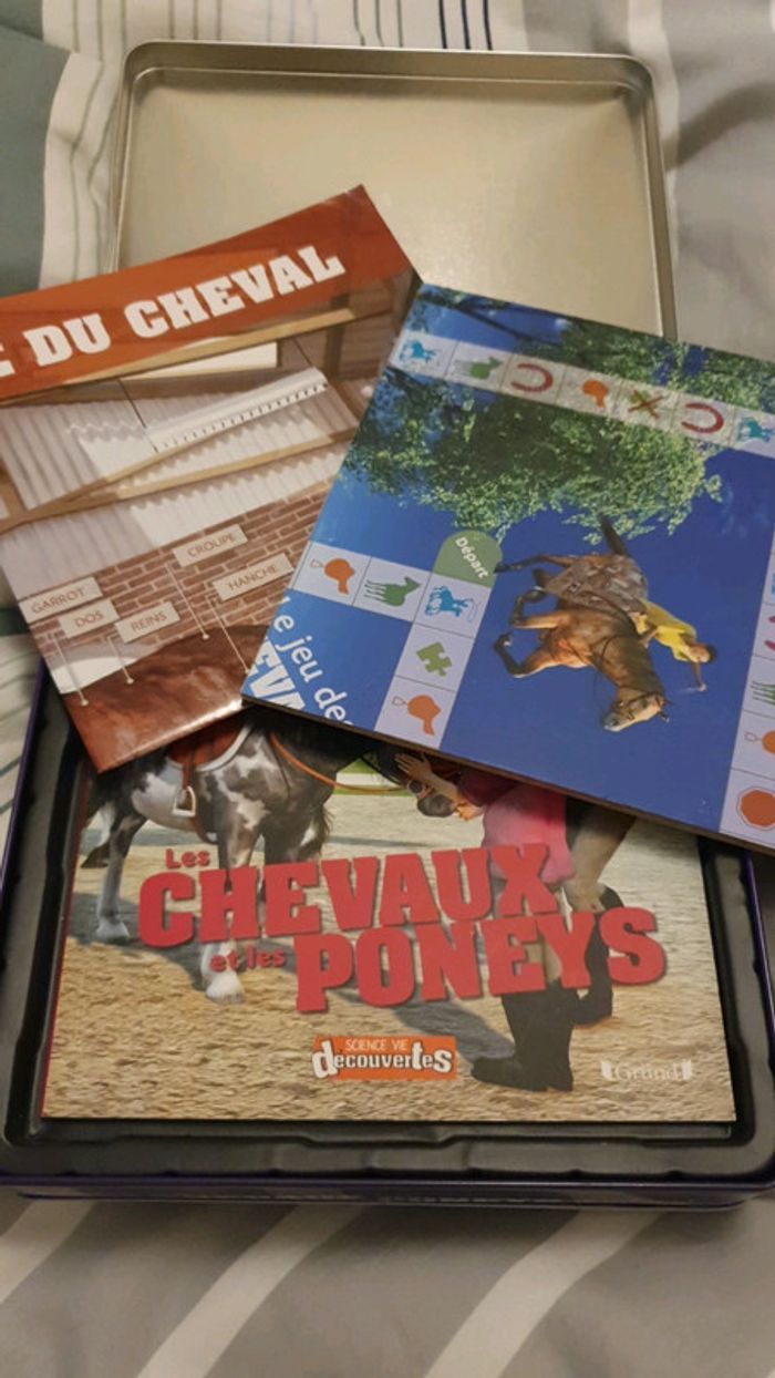Boite rayée et pockée. éléments rayés (affiches livres support jeux)... Cartes pour certaines abimées et rayées. Il manque pas mal de pièces de la maquette du cheval à monter dedans. (Il y a 18 pièces sur 20). Et il manque aussi des cartes questions. (Il y en a 34/50) Envoi rapide et soigné.