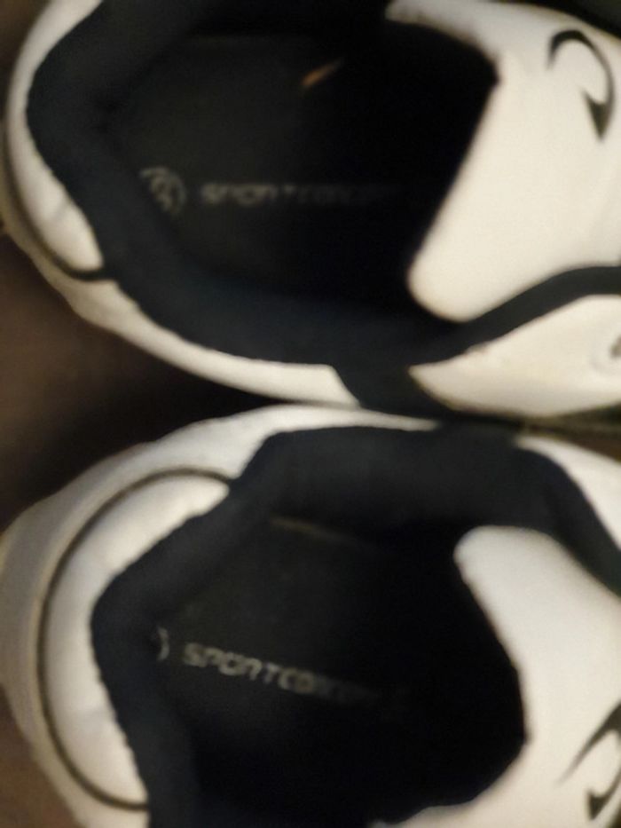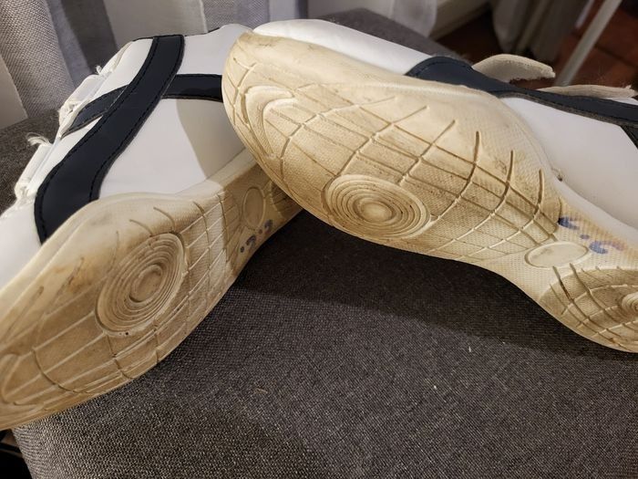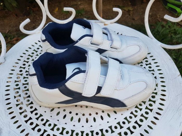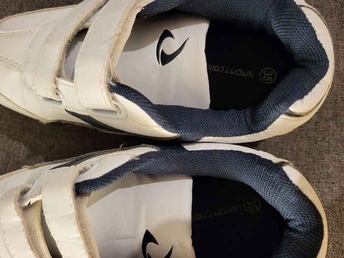 Basket Tex à scratch Blanche et bleue marine Taille 35 Très peu mise mais semelle noire et bout de la chaussure légèrement grise. Cf photos #manou0201_pointure35