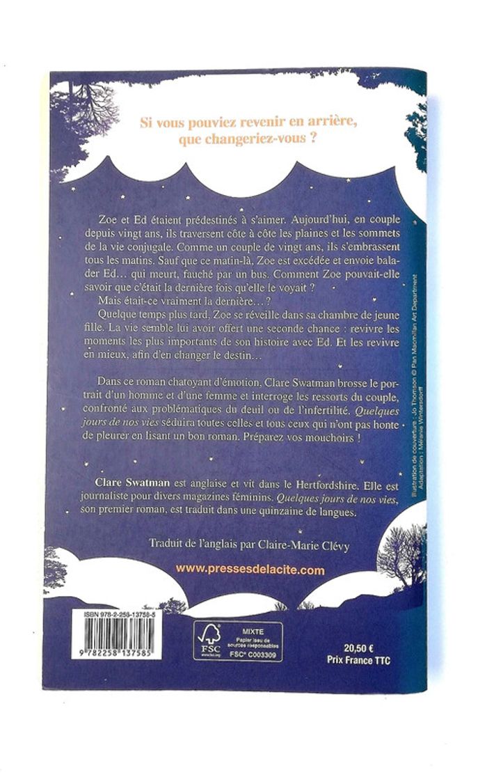 Editeur Presses de la Cité Grand Format Dimensions 13 x 22 cm Couverture souple ISBN 9782258137585 Zoe et Ed étaient prédestinés à s'aimer. Aujourd'hui, en couple depuis vingt ans, ils traversent côte à côte les plaines et les sommets de la vie conjugale. Comme un couple de vingt ans, ils s'embrassent tous les matins. Sauf que ce matin-là. Zoe est excédée et envoie balader Ed... qui meurt, fauché par un bus. Comment Zoe pouvait-elle savoir que c'était la dernière fois qu'elle le voyait ? Mais était-ce vraiment la dernière...? Quelque temps plus tard, Zoe se réveille dans sa chambre de jeune fille. La vie semble lui avoir offert une seconde chance : revivre les moments les plus importants de son histoire avec Ed. Et les revivre en mieux, afin d'en changer le destin... Dans ce roman chatoyant d'émotion, Clare Swatman brosse le portrait d'un homme et d'une femme et interroge les ressorts du couple, confronté aux problématiques du deuil ou de l'infertilité. Quelques jours de nos vies séduira toutes celles et tous ceux qui n'ont pas honte de pleurer en lisant un bon roman. Préparez vos mouchoirs !