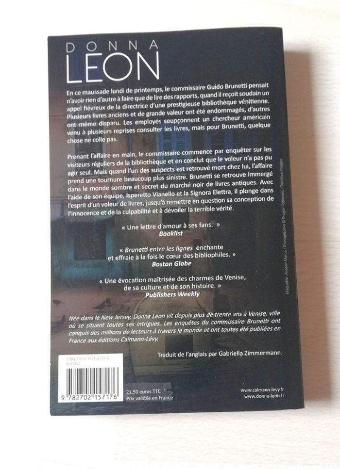 Livre Grand Format, paru 2016 En ce maussade lundi de printemps, le commissaire Guido Brunetti pensait n'avoir rien d'autre à faire que de lire des rapports, quand il reçoit soudain un appel fiévreux de la directrice d'une prestigieuse bibliothèque vénitienne. Plusieurs livres anciens et de grande valeur ont été endommagés, d'autres ont même disparu. Les employés soupçonnent un chercheur américain venu à plusieurs reprises consulter les livres, mais pour Brunetti, quelque chose ne colle pas. Prenant l'affaire en main, le commissaire commence par enquêter sur les visiteurs réguliers de la bibliothèque et en conclut que le voleur n'a pas pu agir seul. Mais quand l'un des suspects est retrouvé mort chez lui, l'affaire prend une tournure beaucoup plus sinistre. Brunetti se retrouve immergé dans le monde sombre et secret du marché noir de livres antiques. Avec l'aide de son équipe, Isperetto Vianello et la Signora Elettra ; il plonge dans l'esprit d'un voleur de livres, jusqu'à remettre en question sa conception de l'innocence et de la culpabilité et à dévoiler la terrible vérité.