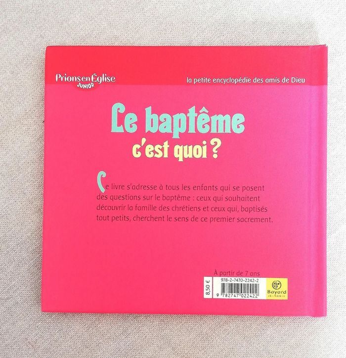 Editeur Bayard Jeunesse - 48 pages Dimensions 15 x 16 cm - Couverture cartonnée - illustrations couleurs Ce livre s'adresse à tous les enfants qui se posent des questions sur le baptème : ceux qui souhaitent découvrir la famille des chrétiens et ceux qui, baptisés tout petits, cherchent le sens de ce premier sacrement.