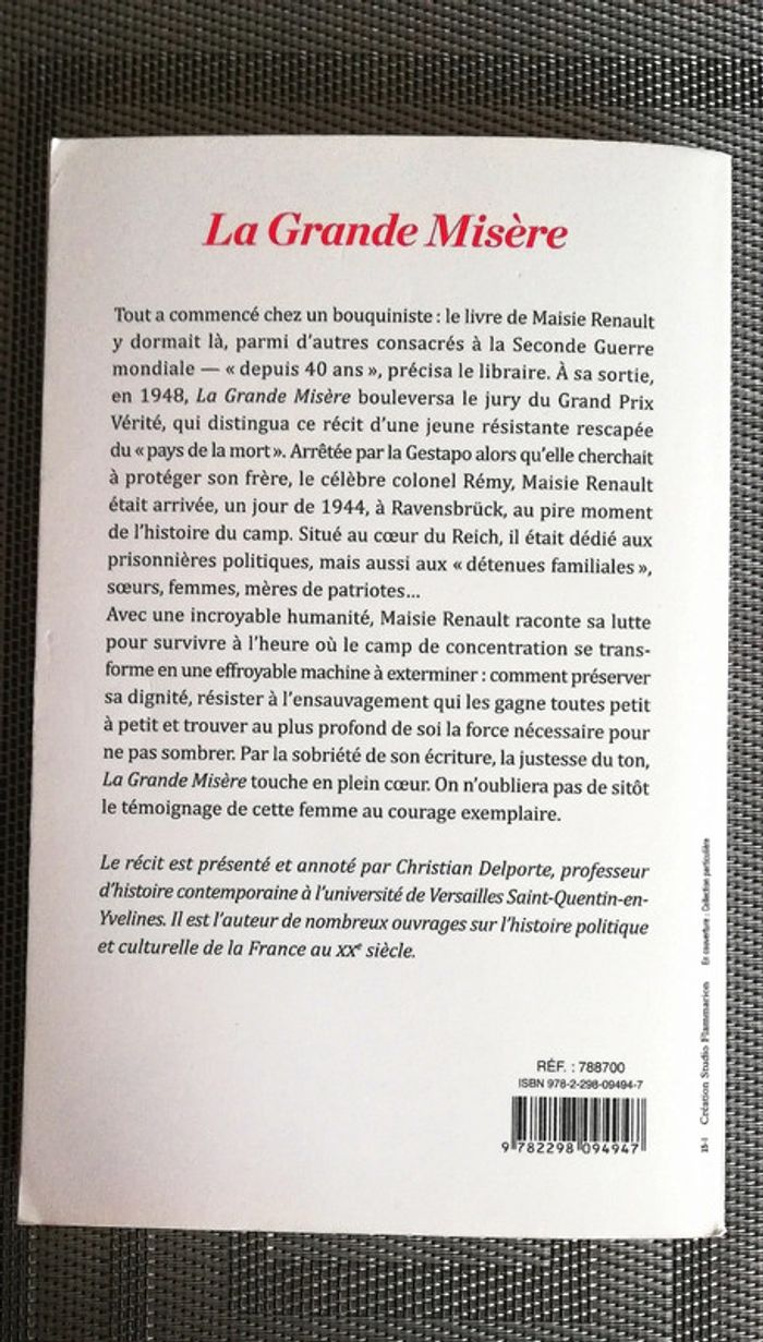 Auteur Maisie Renault Editeur Flammarion paru 2015 Dimensions 13.5 x 21 cm Couverture souple ISBN 9782298094947 Tout a commencé chez un bouquiniste : le livre de Maisie Renault y dormait là, parmi d'autres consacrés à la Seconde Guerre mondiale - "depuis 40 ans", précisa le libraire. À sa sortie, en 1948, La Grande Misère bouleversa le jury du Grand Prix Vérité, qui distingua ce récit d'une jeune résistante rescapée du "pays de la mort".