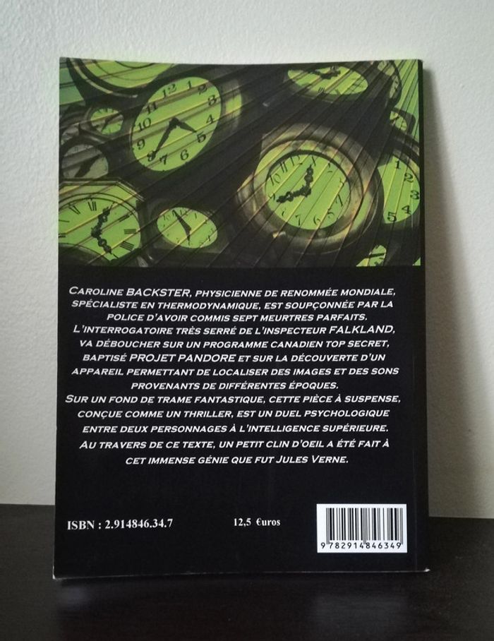 Éditeur, Entre deux rives Caroline Backster, physicienne de renommée mondiale, spécialiste en thermodynamique, est soupçonnée par la police d'avoir commis sept meurtres parfaits. L'interrogatoire très serré de l'inspecteur Falkland va déboucher sur un programme canadien top secret, baptisé Projet Pandore, et sur la découverte d'un appareil permettant de localiser des images et des sons provenant de différentes époques. Sur un fond de trame fantastique, cette pièce à suspense, conçue comme un thriller, est un duel psychologique entre deux personnages à l'intelligence supérieure. Au travers de ce texte, un petit clin d'oeil a été fait à cet immense génie que fut Jules Verne