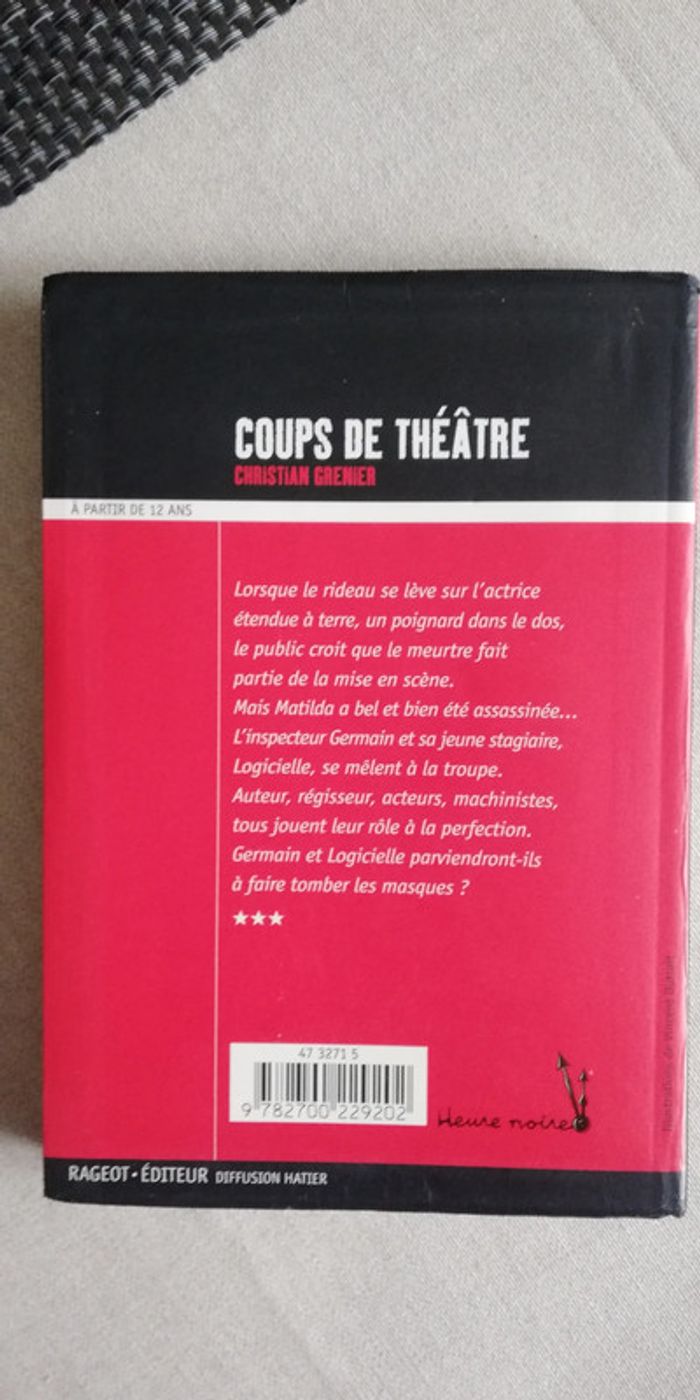 Auteur : Grenier Christian Âge (à partir de) : 12 ans Collection livre : Heure noire Editeur : Rageot Série - Les enquêtes de logicielle ISBN 9782700229202 Format : 13 x 19 cm - 182 pages De coup de théâtre en coup de théâtre, le lecteur participe à la « mise en scène » d'une tragédie policière dans la plus pure tradition du genre et de manière très percutante puisque l'auteur a choisi de raconter l'enquête sous forme de pièce de théâtre : découpage en actes, dialogues et indications de mise en scène. Christian Grenier a plongé son héroïne Logicielle, pour sa première investigation, dans un univers qu'il maîtrise à la perfection.