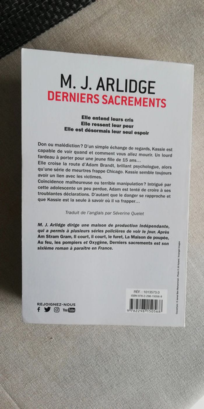 Auteur M.J. ARLIDGE Editeur France Loisirs Dimensions 12.5 x 20 x 3 cm Couverture souple 519 pages ISBN 9782298150568 Ne croisez pas le regard de Kassie... Ou, du haut de ses 15 ans, la jeune fille saura où et quand vous allez mourir. Véritable don, mensonge ou manipulation ? Un tueur en séries frappe Chicago et Kassie semble toujours être liée à ces meurtres. Adam Brandt, brillant psychologue judiciaire, saura-t-il élucider le mystère qui entoure la jeune fille ?