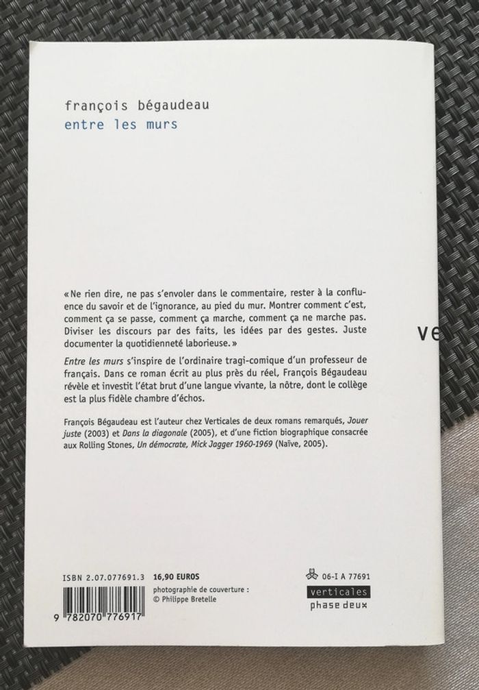Le lecteur est plongé entre les murs d'un collège, une année durant, selon une alternance implacable entre salle de cours et salle des professeurs. Dialogue brutal entre profs et collégiens, avec son lot de malentendus et d'agressions. Prix France culture-Télérama 2006. Palme d'or 2008 à Cannes pour l'adaptation cinématographique. Offre le livre de poche du même auteur Un démocrate Mick Jagger 1960-1969