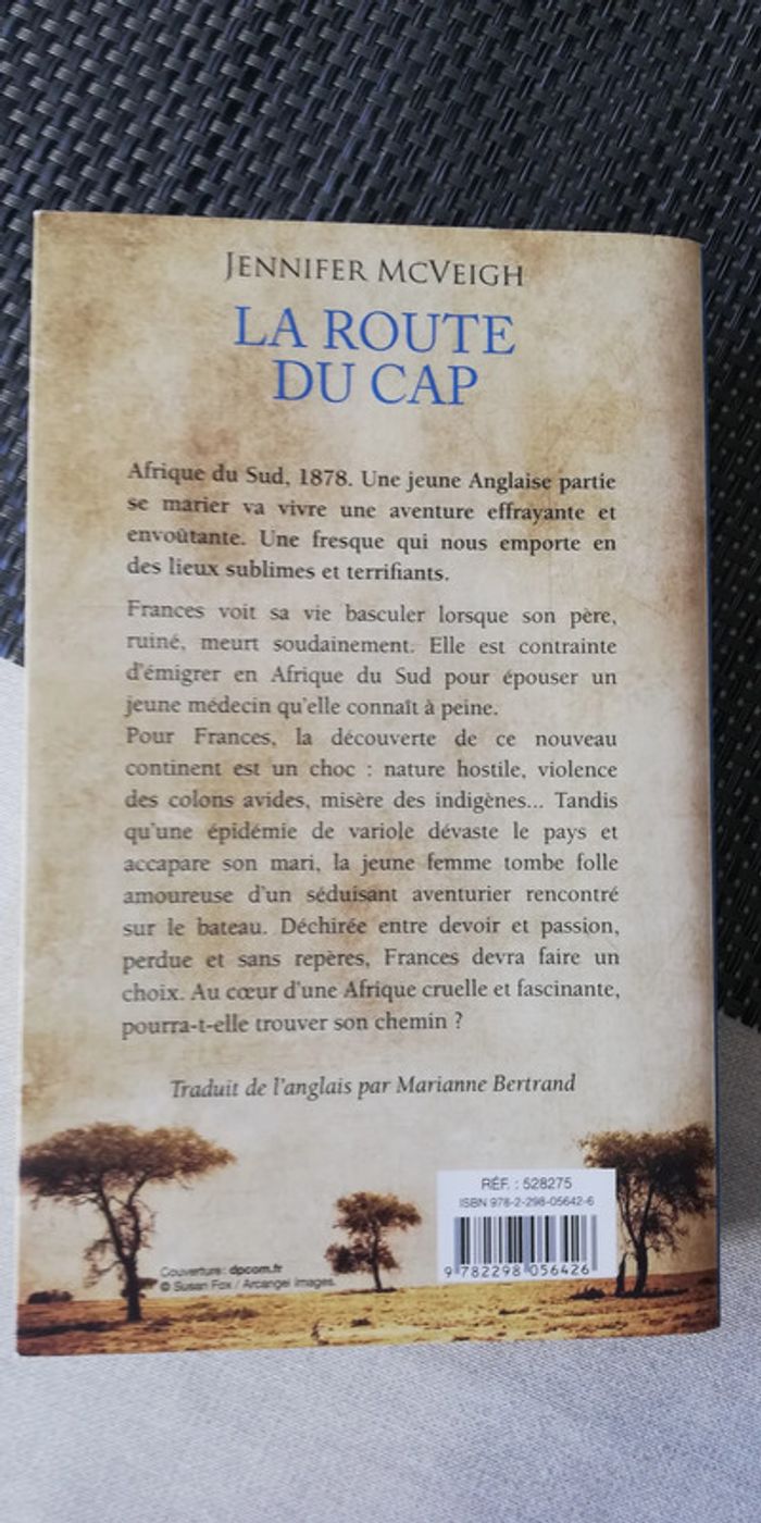 Auteur Jennifer Mcveigh Éditeur France Loisirs Dimensions 12.5x20x3.5cm Nombre de pages 568 ISBN 9782298056426 Une très belle histoire qui vous transporte en Afrique du Sud du temps des pionniers diamantaires. Entre amours, mensonges et trahisons.