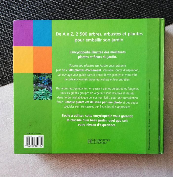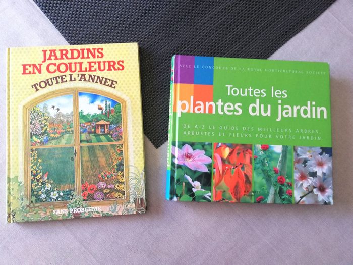 2 livres sur les plantes avec Couverture cartonné prix à l’unité ou le lot 10€ - Jardins En Couleurs Toute L'année – 5€ ISBN 2700057198 Editeur : Gründ Collection : Sans Problème Auteur  : de David Pople Nombre de pages : 128 Dimensions : 25.5 x 22 cm - Toutes Les Plantes Du Jardin  8€ ISBN 9782012369405 Auteur(s) : Ian Spence - Royal Horticultural Society Editeur : Hachette Nombre de pages : 384 Dimensions : 24.00 x 27.00 x 3 cm L'encyclopédie illustrée des meilleures plantes et fleurs du jardin. Toutes les plantes du jardin vous présente plus de 2 500 plantes d'ornement. Véritable source d'inspiration, cet ouvrage vous guide dans le choix de vos plantes et vous offre de précieux conseils pour leur culture et leur entretien. Des arbres aux grimpantes, en passant par les bulbes et les fougères, tous les grands groupes de végétaux sont recensés et classés dans l'ordre alphabétique de leur nom latin, pour une consultation facile. Chaque plante est illustrée par une photo et des pages spéciales sont consacrées aux fleurs les plus appréciées. Facile à utiliser, cette encyclopédie vous garantit la réussite d'un beau jardin, quel que soit votre niveau d'expérience.