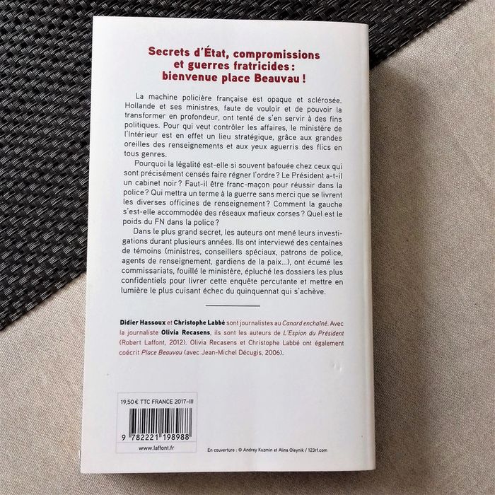 Secrets d'État, compromissions et guerres fratricides : bienvenue place Beauvau ! Auteur(s) : Olivia Recasens - Hassoux Didier - Labbé Christophe Editeur : Robert Laffont Parution : 23/03/2017 Nombre de pages : 264 Dimensions : 21.50 x 13.50 x 2.2 Dans le plus grand secret, les auteurs ont mené leurs investigations durant plusieurs années. Ils ont interviewé des centaines de témoins (ministres, conseillers spéciaux, patrons de police, agents de renseignement, gardiens de la paix...), ont écumé les commissariats, fouillé le ministère, épluché les dossiers les plus confidentiels pour livrer cette enquête percutante et mettre en lumière le plus cuisant échec du quinquennat qui s'achève.