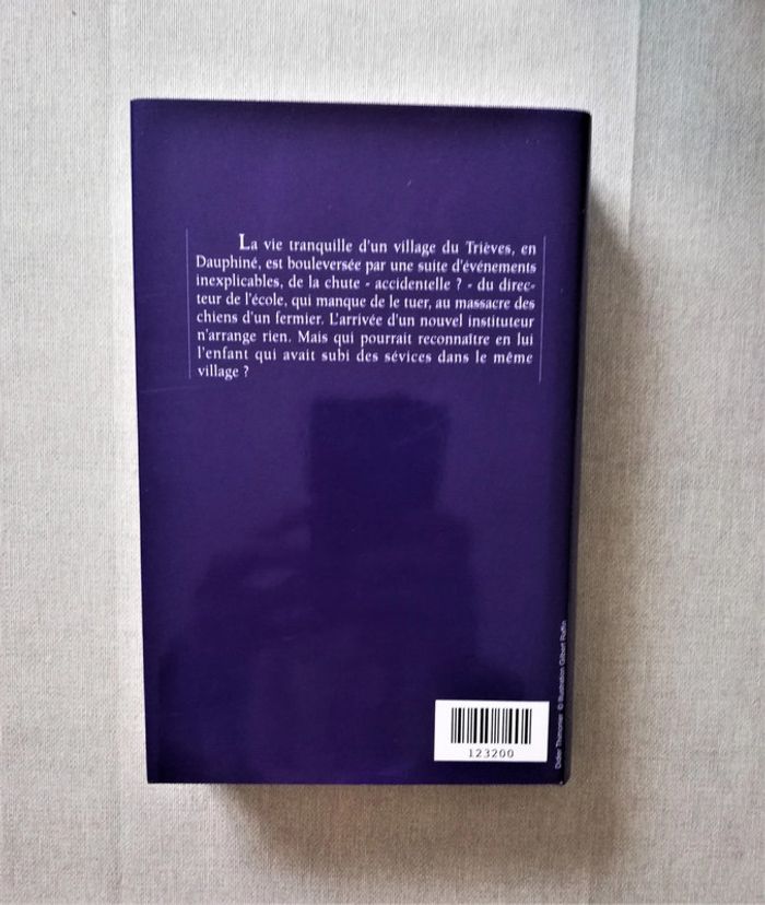 ISBN 2744102377 Auteur(s) : Brigitte Varel Editeur : France Loisirs Livre cartonné avec jaquette La vie tranquille d'un village du Trièves, en Dauphiné, est bouleversé par une suite d'événements inexplicables, de la chute -accidentelle ?- du directeur de l'école, qui manque de le tuer, au massacre des chiens d'un fermier. L'arrivée d'un nouvel instituteur n'arrange rien. Mais qui pourrait reconnaitre en lui l'enfant qui avait subi des sévices dans le même village ?