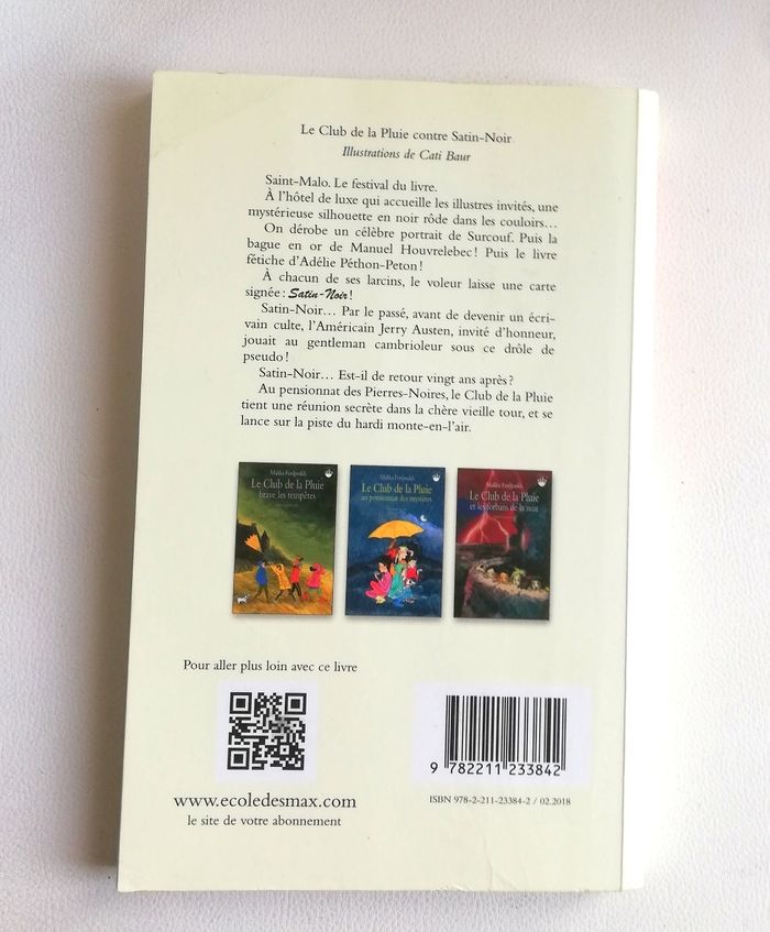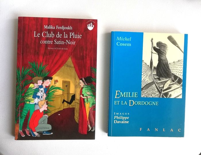 2 Livres à 3€ l’ unité / lot 5€ Emilie Et La Dordogne - Michel Cosem ISBN 9782865771929 Auteur(s) : Michel Cosem - Davaine Philippe Editeur : Editions Fanlac Parution : 01/10/1997 Émilie, malheureuse chez les Souye, part sur la Dordogne avec la barque de pêcheur Chaos à la recherche de Julien. Elle va vivre au rythme de l’eau, croisera les gens du fleuve, et, dans sa quête de liberté, rencontrera un châtelain, le grand cerf blanc et une fée. Au bout de son long voyage, elle comprendra le fleuve et trouvera une solution aux énigmes de sa vie. Le club de la pluie contre satin noir ISBN 9782211233842 Auteur(s) : Ferdjoukh Malika Editeur : L'école Des Loisirs Collection : Maxima Parution : 01/01/2018 Une bande de copains, nommée le Club de la Pluie, participent avec leur professeur de français à un Salon du Livre à Saint-Malo. Ils se retrouvent mêlés à une série de mystérieuses disparitions d'objets