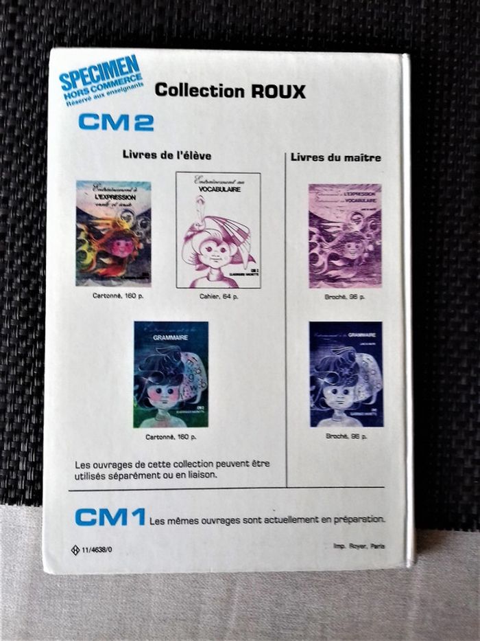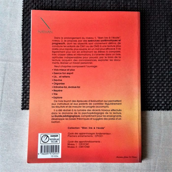 5€ pour chaque livre faites votre demande à l’unité pour une annonce réservé - Bien Lire A L'école Niveau 2 ISBN 9782091510545 Auteur(s) : Chevallier Brigitte Editeur : Nathan Collection : Bien Lire A L'école Parution : 26/05/1998 Nombre de pages : 143 - Dimensions : 26 x 19.1 x 1 Dans le prolongement du niveau 1, " Bien lire à l'école ", niveau 2, se propose, par des exercices systématiques et progressifs, dont les objectifs sont clairement définis, de conduire les enfants de CM1 ou de CM2 à une lecture plus aisée, plus rapide, plus souple, en un mot plus efficace. Neuf chapitres composent l’ouvrage : "Vois mieux et plus", "Exerce ton esprit, "Lis..", "et retiens", "Devine", "Organise", "Entraîne-toi, évalue-toi", "Repère", "Trie", "Explore." - Entraînement À L'expression Orale Et Écrite - C.M. 2 Spécimen hors commerce réservé aux enseignants. Auteur(s) : Roux Illustrations de Antoine Arnaud Editeur : Hachette Parution : 01/09/79 Reliure Cartonné - Nombre de pages :159 Dimensions : 24.5 x 17 x 1.5 permettre une meilleure transition entre l'école primaire et le collège Comprendre, s'exprimer en utilisant la langue française à l'oral et à l'écrit Le français a pour objectif principal au cycle 3 la maitrise de la langue française qu'il développe dans trois champs d'activités langagières : le langage oral, la lecture et l'écriture. Il y contribue également par l'étude de la langue qui permet aux élèves de réfléchir sur son fonctionnement, en particulier pour en comprendre les régularités et assurer les principaux accords orthographiques.